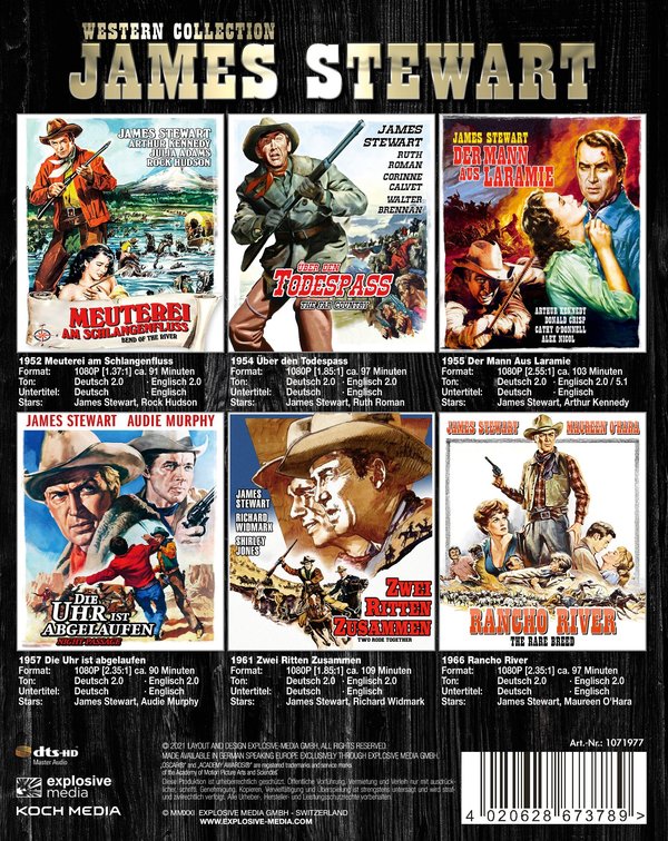 Die sechs großartigen Western Filme gehören zum Besten, was dieses Genre in über 100 Jahren Filmgeschichte auf die Beine gebracht hat und sind auch heute noch wegweisend. Der zweifache Oscar-Preisträger James Stewart wird zu Recht als einer der größten Leinwand-Helden Hollywoods gefeiert und wartet mit einer schier endlosen Liste an Auszeichnungen auf. Alle der Western haben sehr viel zu bieten; Regie führten die Pioniere des Genres, allen voran Anthony Mann und John Ford, die Szenenbilder und Originalschauplätze sind beeindruckend und die Soundtracks stammen von einigen der besten Komponisten der Filmgeschichte. Diese sechs Western gehören einfach in jede Western-Sammlung.