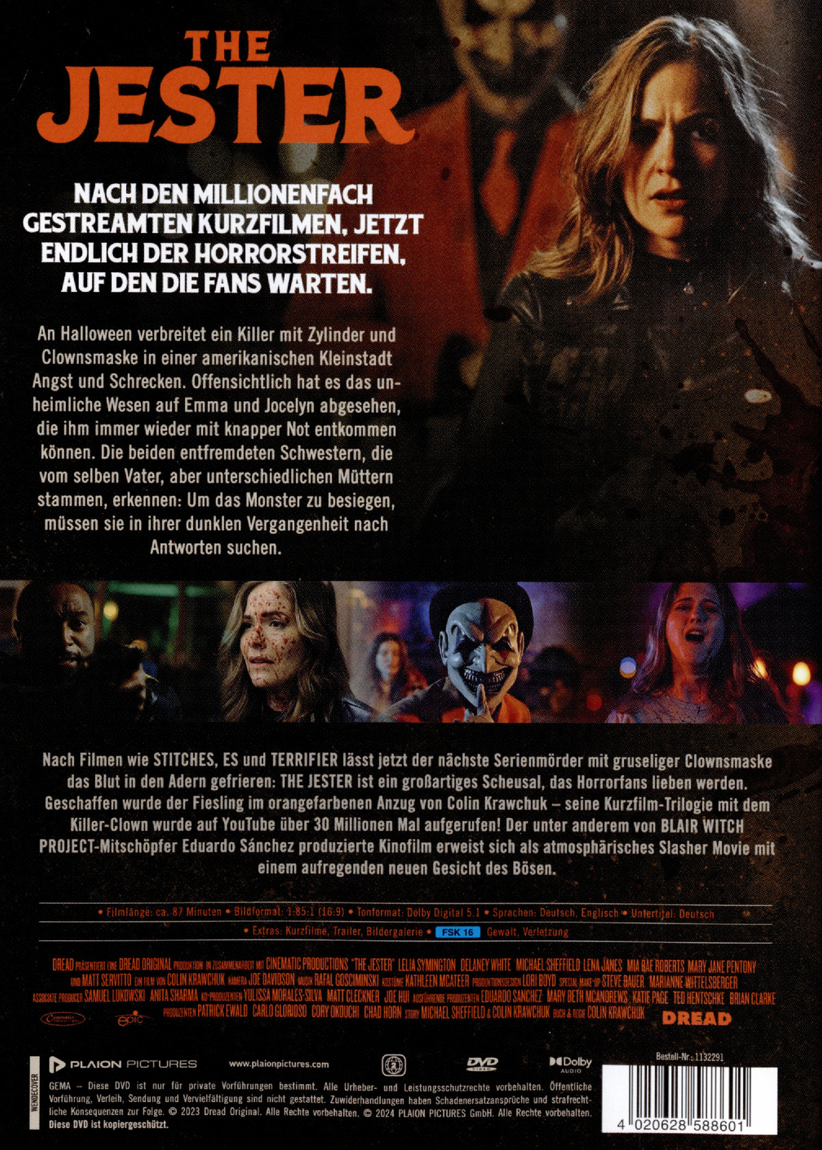 Nach Filmen wie STITCHES, ES und TERRIFIER lässt jetzt der nächste Serienmörder mit gruseliger Clownsmaske das Blut in den Adern gefrieren: THE JESTER ist ein großartiges Scheusal, das Horrorfans lieben werden. Geschaffen wurde der Fiesling im orangefarbenen Anzug von Colin Krawchuk – seine Kurzfilm-Trilogie mit dem Killer-Clown wurde auf YouTube über 30 Millionen Mal aufgerufen! Der unter anderem von BLAIR WITCH PROJECT-Mitschöpfer Eduardo Sánchez produzierte Kinofilm erweist sich als atmosphärisches Slasher Movie mit einem aufregenden neuen Gesicht des Bösen.