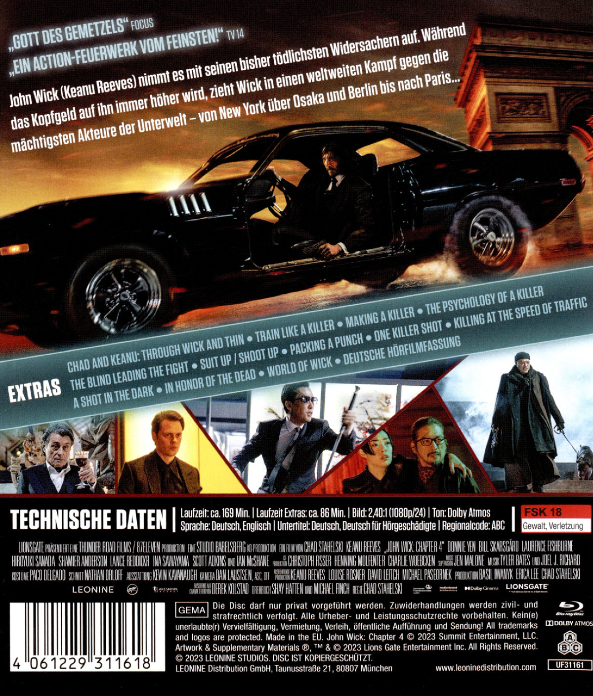 John Wick entdeckt einen Weg, die Hohe Kammer zu besiegen. Doch bevor er sich seine Freiheit verdienen kann, muss Wick gegen einen neuen Feind antreten, der mächtige Allianzen auf der ganzen Welt hat und über Kräfte verfügt, alte Freunde zu Feinden werden zu lassen. An der Seite von Keanu Reeves alias John Wick sind auch in Kapitel 4 wieder Laurence Fishburne ("Ant-Man And The Wasp"), Lance Reddick ("Godzilla vs. Kong", "Angel Has Fallen") und Ian McShane ("Pirates Of The Caribbean - Fremde Gezeiten") zu sehen. Ergänzt wird der Cast u.a. durch Bill Skarsgård ("Es", "Deadpool 2"), Donnie Yen ("Rogue One: A Star Wars Story", "xXx: Die Rückkehr des Xander Cage") und Scott Adkins ("Doctor Strange", "Das Bourne Ultimatum"). Regie führt erneut Chad Stahelski. Presse: - "Gott des Gemetzels!" - (FOCUS) - "Ein Action-Feuerwerk vom Feinsten!" - (TV 14)