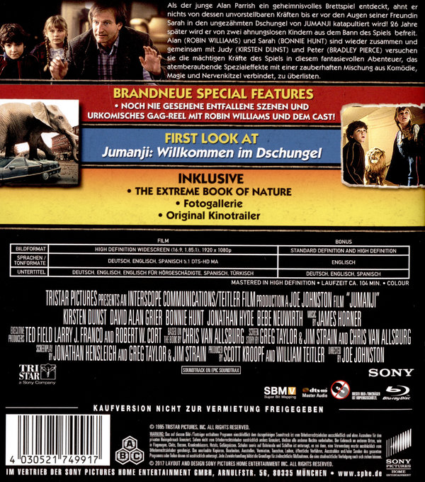 Brandneue Special Features; First Look at "Jumanji: Willkommen im Dschungel"; The Extreme Book of Nature; Fotogallerie; Original Kinotrailer;