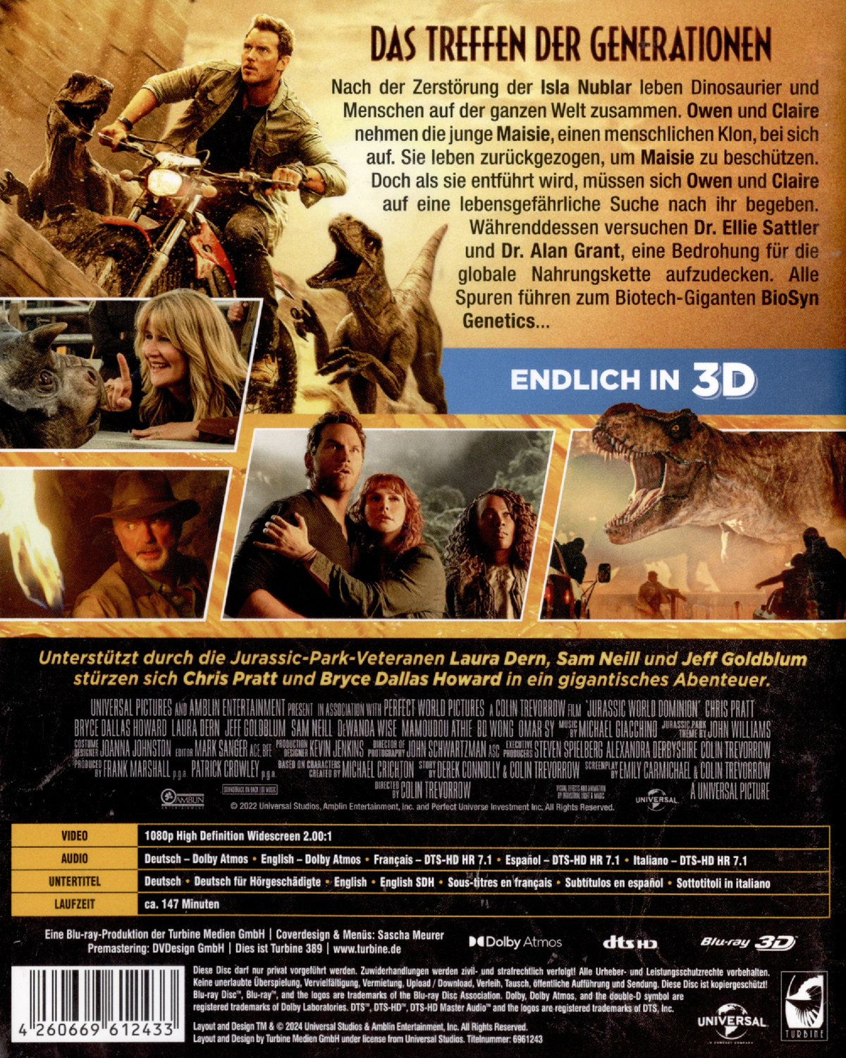 Das Treffen der Generationen! Nach der Zerstörung der Isla Nublar leben Dinosaurier und Menschen auf der ganzen Welt zusammen. Owen und Claire nehmen die junge Maisie, einen menschlichen Klon, bei sich auf. Sie leben zurückgezogen, um Maisie zu beschützen. Doch als sie entführt wird, müssen sich Owen und Claire auf eine lebensgefährliche Suche nach ihr begeben. Währenddessen versuchen Dr. Ellie Sattler und Dr. Alan Grant, eine Bedrohung für die globale Nahrungskette aufzudecken. Alle Spuren führen zum Biotech-Giganten BioSyn Genetics... Chris Pratt, Bryce Dallas Howard, Laura Dern, Sam Neill und Jeff Goldblum stürzen sich gemeinsam ins Abenteuer.