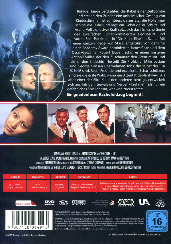 Ruhige Hände verdrahten die Kabel einer Zeitbombe und stellen den Zünder ein; unheimlicher Gesang von Kinderstimmen ist zu hören, da zerfetzt die Höllenmaschine die Ruhe und legt ein Gebäude in Schutt und Asche. Voll explosiver Kraft setzt sich das filmische Genie des zweifachen Oscar-nominierten Regisseurs und Autors Sam Peckinpah in "Die Killer Elite" in Szene. Mit einer ganze Riege von Stars, angeführt von dem für einen Academy Award nominierten James Caan und dem Oscar-Gewinner Robert Duvall, schuf er einen finsteren Action-Thriller, der den Zuschauern den Atem raubt und sie an den Bildschirm fesselt! Die Profikiller Mike Locken und George Hansen übernehmen Jobs, die selbst der CIA zu heiß sind. Beste Freunde und exzellente Scharfschützen, sind sie die erste Wahl, wenn eine Attentat geplant wird. Als aber einer der Elite-Killer den anderen betrügt, entwickelt sich aus Intrige, Gewalt und Nervenkitzel mehr als nur eine gefährliches Spiel darum, wer wen zuerst tötet: Ein gnadenloser Rachefeldzug beginnt!