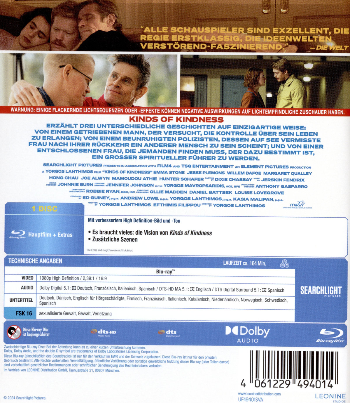 Drei Schicksale, drei Rätsel. 'Kinds of Kindness' ist eine Triptychon-Fabel über einen Mann ohne Wahl, der versucht, die Kontrolle über sein eigenes Leben zu übernehmen, dazu einen Polizisten, der beunruhigt darüber ist, dass seine auf See vermisste Frau zurückgekehrt ist und ein anderer Mensch zu sein scheint, sowie eine Frau, die entschlossen ist, einen bestimmten Menschen mit besonderen Fähigkeiten zu finden, der dazu bestimmt ist, ein erstaunlicher spiritueller Führer zu werden... Im Searchlight-Pictures-Drama 'Kinds of Kindness' (2024) von 'Poor Things' Regisseur Yorgos Lanthimos nach dem Drehbuch von Lanthimos und Efthimis Filippou, starbesetzt mit Emma Stone, Jesse Plemons, Willem Dafoe, Margaret Qualley, Hong Chau, Joe Alwyn, Mamoudou Athie und Hunter Schafer, beim Kinostart am 21. Juni 2024.