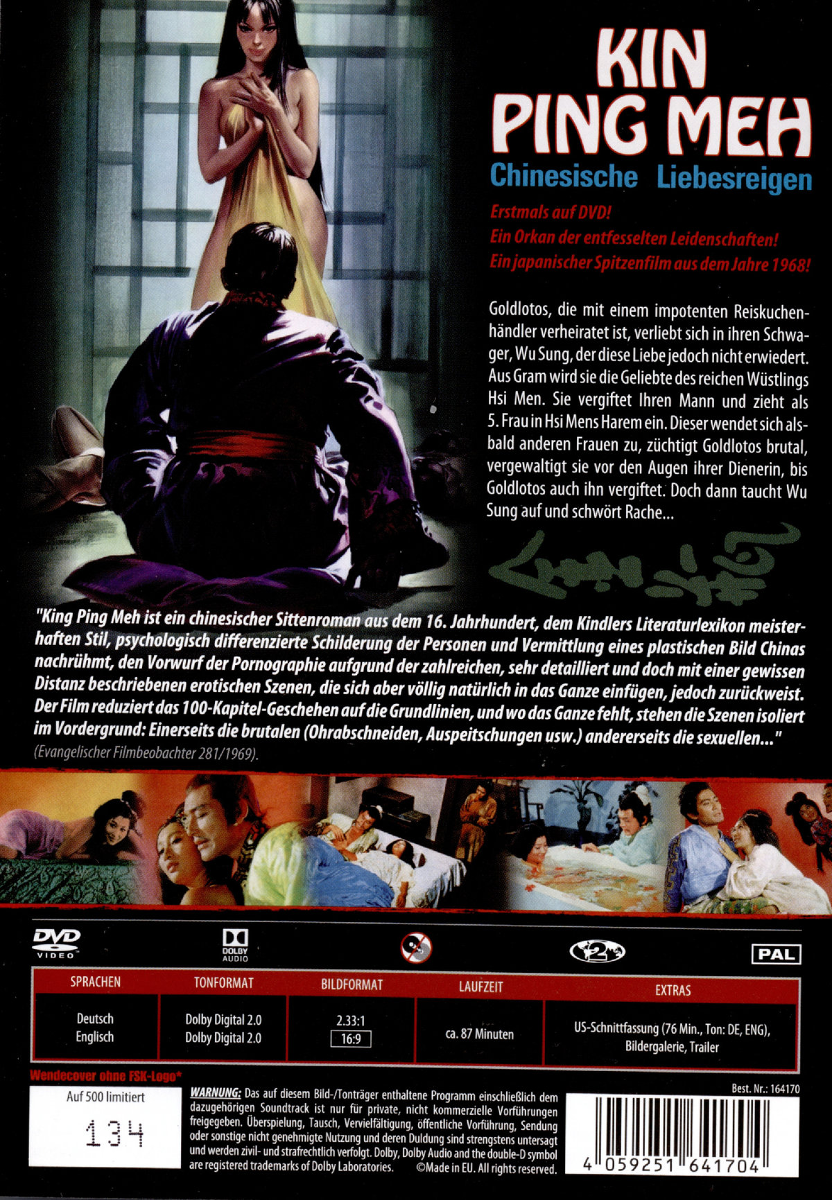 Ein Orkan der entfesselten Leidenschaften! Goldlotos, die mit einem impotenten Reiskuchenhändler verheiratet ist, verliebt sich in ihren Schwager, Wu Sung, der diese Liebe jedoch nicht erwiedert. Aus Gram wird sie die Geliebte des reichen Hsi Men. Sie vergiftet Ihren Mann und zieht als 5. Frau in Hsi Mens Harem ein. Dieser wendet sich alsbald anderen Frauen zu, züchtigt Goldlotos brutal, vergewaltigt sie vor den Augen ihrer Dienerin, bis Goldlotos auch ihn vergiftet. Dann taucht Wu Sung auf und schwört Rache... "King Ping Meh ist ein chinesischer Sittenroman aus dem 16. Jahrhundert, dem Kindlers Literaturlexikon meisterhaften Stil, psychologisch differenzierte Schilderung der Personen und Vermittlung eines plastischen Bild Chinas nachrühmt, den Vorwurf der Pornographie aufgrund der zahlreichen, sehr detailliert und doch mit einer gewissen Distanz beschriebenen erotischen Szenen, die sich aber völlig natürlich in das Ganze einfügen, jedoch zurückweist. Der Film reduziert das 100-Kapitel-Geschehen auf die Grundlinien, und wo das Ganze fehlt, stehen die Szenen isoliert im Vordergrund: Einerseits die brutalen (Ohrabschneiden, Auspeitschungen usw.) andererseits die sexuellen..." (Evangelischer Filmbeobachter 281/1969).