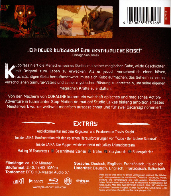 Mit grandiosen Stop-Motion-Filmen, wie CORPSE BRIDE von Tim Burton, CORALINE oder PARANORMAN sorgte das Animationsstudio Laika für Begeisterung in den Kinosälen. In KUBO – DER TAPFERE SAMURAI drehten sie ein düsteres, poetisches und prachtvoll inszeniertes Abenteuer, das gleich einen Rekord brach. Das im Original fünf Meter große und 180 Kilogramm schwere Skelett, ist die größte Stop-Motion-Puppe der Filmgeschichte.