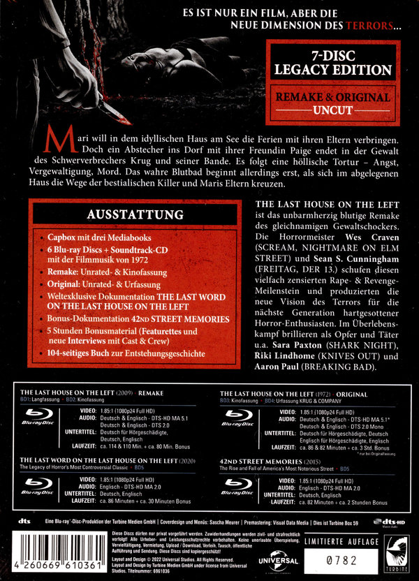 Inhaltsangabe: Es ist nur ein Film, aber die neue Dimension des Terrors... Eigentlich will Mari in dem idyllischen Haus am See die Ferien mit ihren Eltern verbringen. Doch ein Abstecher ins Dorf mit ihrer Freundin Paige endet in der Gewalt des Schwerverbrechers Krug und seiner Bande. Es folgt eine höllische Tortur - Angst, Vergewaltigung, Mord. Doch das wahre Blutbad beginnt erst, als sich im abgelegenen Haus die Wege der bestialischen Killer und Maris Eltern kreuzen. THE LAST HOUSE ON THE LEFT ist das unbarmherzig blutige Remake des gleichnamigen Gewaltschockers. Die Horrormeister Wes Craven (SCREAM, NIGHTMARE ON ELM STREET) und Sean S. Cunningham (FREITAG, DER 13.) schufen diesen vielfach zensierten Rape- & Revenge-Meilenstein und produzierten die neue Vision des Terrors für die nächste Generation hartgesottener Horror-Enthusiasten. Im Überlebenskampf brillieren als Opfer und Täter u.a. Sara Paxton (SHARK NIGHT), Riki Lindhome (KNIVES OUT) und Aaron Paul (BREAKING BAD). Die Legacy-Edition mit allen Uncut-Filmversionen bietet in einer Capbox drei Mediabooks mit sechs Blu-ray Discs: Die Unrated- und Kinofassung des Remakes, das Original und dessen Urfassung, die weltexklusive Dokumentation THE LAST WORD ON THE LAST HOUSE ON THE LEFT sowie 42nd STREET MEMORIES zur LAST HOUSE-Kino-Ära. Fünf Stunden Bonusmaterial bieten Featurettes und neue Interviews. Die CD enthält den Original-Soundtrack. Das 104-seitige Buch Legacy of the Last House von Tobias Hohmann erzählt die Entstehungsgeschichte der beiden Terror-Schocker. Diese ultimative Edition ist auf 2.000 Stück limitiert.
