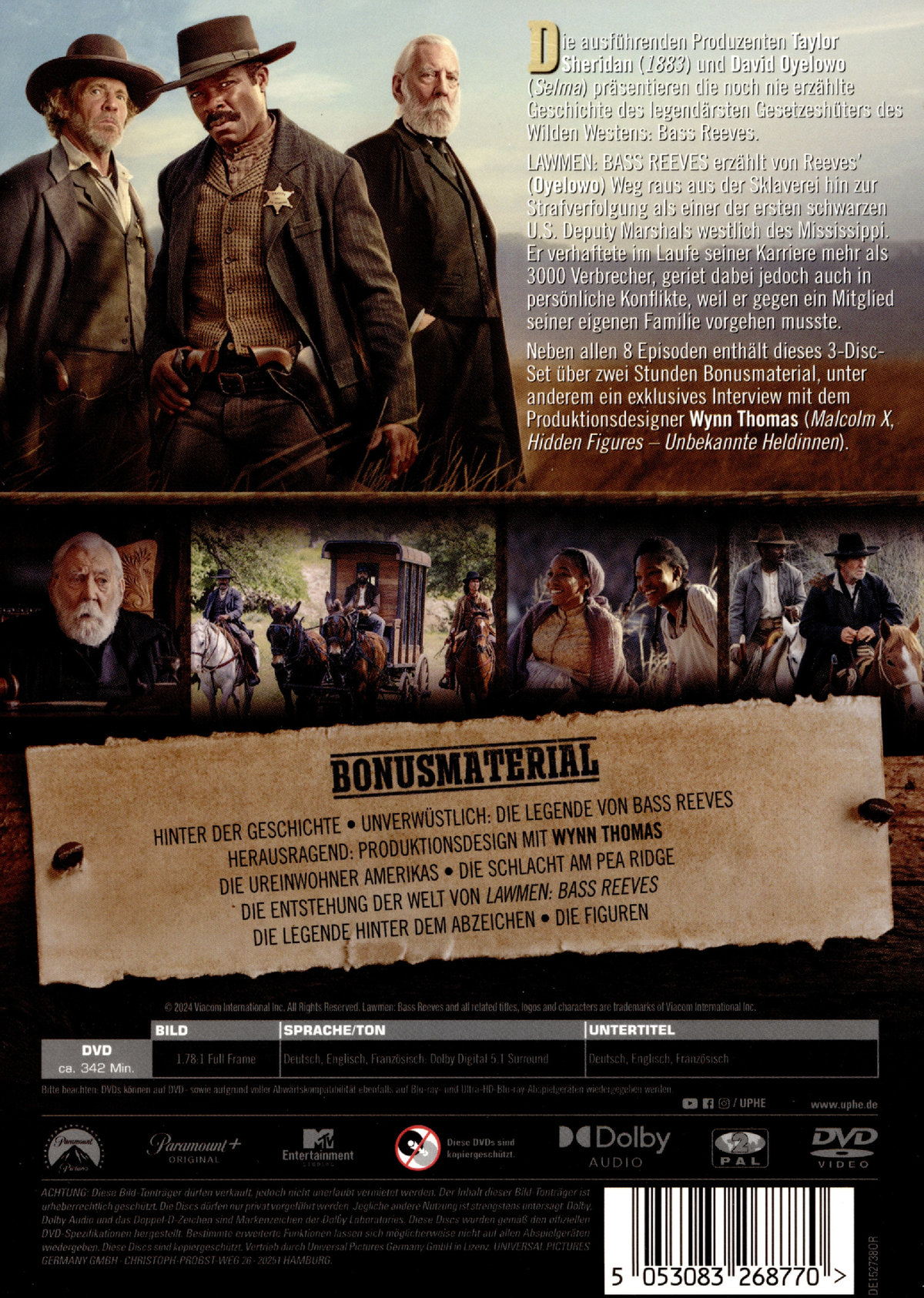 Die ausführenden Produzenten Taylor Sheridan ("1883") und David Oyelowo ("Selma") präsentieren die noch nie erzählte Geschichte des legendärsten Gesetzeshüters des Alten Westens: Bass Reeves.Der Gesetzeshüter Bass Reeves (David Oyelowo) war einer der größten Helden des Wilden Westens. Erzählt wird sein Weg raus aus der Sklaverei hin zur Strafverfolgung als einer der ersten schwarzen U.S. Deputy Marshals westlich des Mississippi. Er arbeitete als Friedensoffizier im Territorium der Indianer. Obwohl er im Laufe seiner Karriere mehr als 3.000 Gesetzlose verhaftete, rang er gleichzeitig mit der moralischen Last auf Kosten seiner geliebten Familie. Neben allen 8 Episoden enthält dieses 3-Discs-Set über zwei Stunden Bonusmaterial, unter anderem ein exklusives Interview mit dem Production Designer Wynn Thomas ("Malcolm X", "Hidden Figures - Unbekannte Heldinnen"). Episodenübersicht- Teil I- Teil II- Teil III- Teil IV- Teil V- Teil VI- Teil VII- Teil VIII