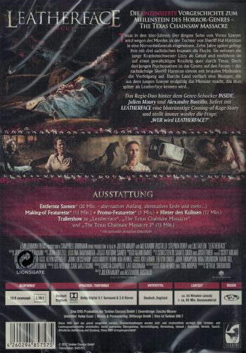 Texas in den 50er-Jahren: Der jüngste Sohn von Verna Sawyer wird wegen des Mordes an der Tochter von Sheriff Hal Hartmann in eine Nervenheilanstalt eingewiesen. Zehn Jahre später gelingt ihm mit drei sadistischen Insassen die Flucht. Sie nehmen die junge Krankenschwester Lizzy als Geisel und entführen sie auf einen gewalttätigen Roadtrip quer durchs Texas. Doch den jungen Psychopathen ist das Gesetz auf den Fersen – der rachsüchtige Sheriff Hartman nimmt mit brutalen Methoden die Verfolgung auf. Durchs Land verläuft eine Blutspur, die aus dem jungen Sawyer endgültig das Monster macht, das man später als Leatherface kennen wird… Das Regie-Duo hinter dem Genre-Schocker INSIDE, Julien Maury und Alexandre Bustillo, liefert mit LEATHERFACE eine blutrünstige Coming-of-Rage-Story und stellt immer wieder die Frage „WER wird LEATHERFACE?