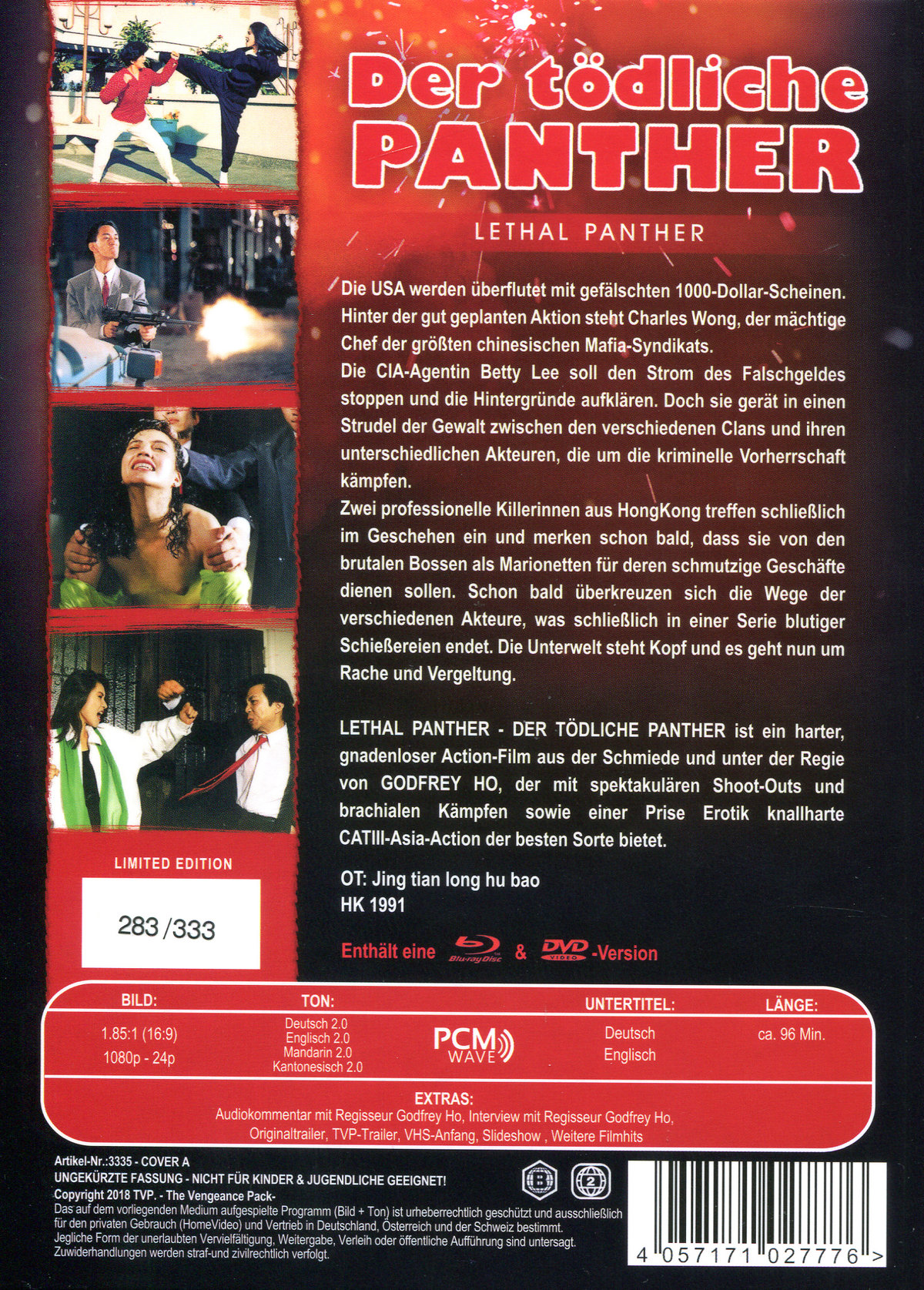 - Streng limitiertes Mediabook - HD-Weltpremiere - 16-seitiges Booklet mit einem Text von Nando Rohner - Audiokommentar mit Regisseur Godfrey Ho - Interview mit Regisseur Godfrey Ho - Originaltrailer - TVP-Trailer - VHS-Anfang - Slideshow - Weitere Filmhits - DVD-Version Zusatzinfo: LETHAL PANTHER - DER TÖDLICHE PANTHER ist ein harter, gnadenloser Action-Film aus der Schmiede und unter der Regie von GODFREY HO, der mit spektakulären Shoot-Outs und brachialen Kämpfen sowie einer Prise Erotik knallharte CATIII-Asia-Action der besten Sorte bietet.