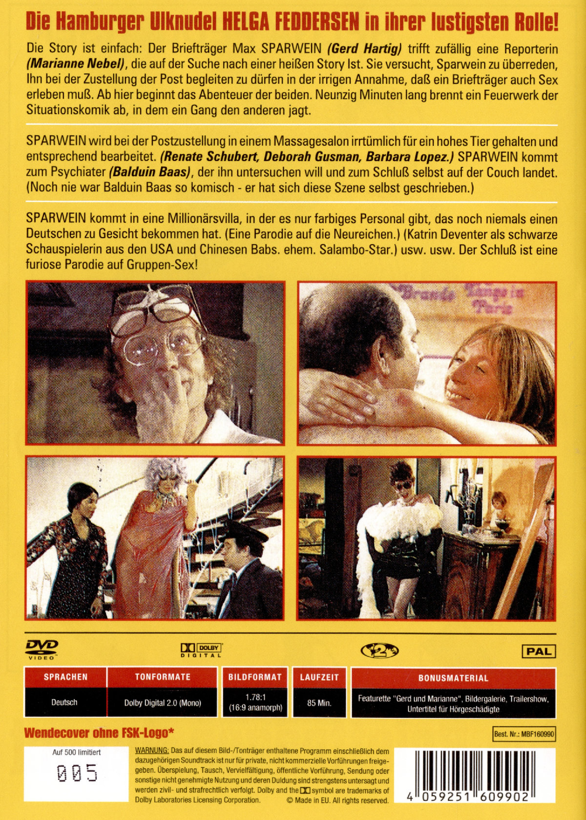 Die Hamburger Ulknudel HELGA FEDDERSEN in ihrer lustigsten Rolle! Die Story ist einfach: Der Briefträger Max SPARWEIN (Gerd Hartig) trifft zufällig eine Reporterin (Marianne Nebel), die auf der Suche nach einer heißen Story Ist. Sie versucht, Sparwein zu überreden, Ihn bei der Zustellung der Post begleiten zu dürfen in der irrigen Annahme, daß ein Briefträger auch Sex erleben muß. Ab hier beginnt das Abenteuer der beiden. Neunzig Minuten lang brennt ein Feuerwerk der Situationskomik ab, in dem ein Gang den anderen jagt. SPARWEIN wird bei der Postzustellung in einem Massagesalon irrtümlich für ein hohes Tier gehalten und entsprechend bearbeitet. (Renate Schubert, Deborah Gusman, Barbara Lopez.) SPARWEIN kommt zum Psychiater (Balduin Baas), der ihn untersuchen will und zum Schluß selbst auf der Couch landet. (Noch nie war Balduin Baas so komisch - er hat sich diese Szene selbst geschrieben.) SPARWEIN kommt in eine Millionärsvilla, in der es nur farbiges Personal gibt, das noch niemals einen Deutschen zu Gesicht bekommen hat. (Eine Parodie auf die Neureichen.) (Katrin Deventer als schwarze Schauspielerin aus den USA und Chinesen Babs. ehem. Salambo-Star.) usw. usw. Der Schluß ist eine furiose Parodie auf Gruppen-Sex!