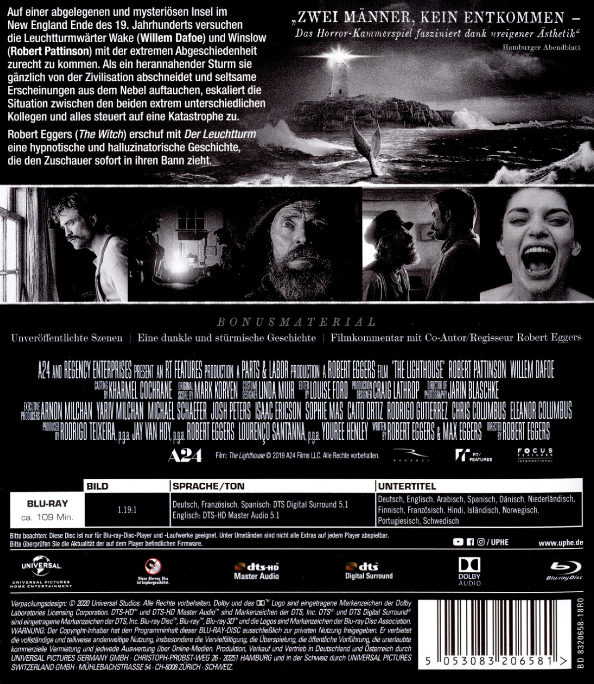 "Zwei Männer, kein Entkommen - Das Horror-Kammerspiel fasziniert dank ureigener Ästhetik." (Hamburger Abendblatt)Auf einer abgelegenen und mysteriösen Insel im New England Ende des 19. Jahrhunderts versuchen die Leuchtturmwärter Wake (Willem Dafoe) und Winslow (Robert Pattinson) mit der extremen Abgeschiedenheit zurechtzukommen. Als ein herannahender Sturm sie gänzlich von der Zivilisation abschneidet und seltsame Erscheinungen aus dem Nebel auftauchen, eskaliert die Situation zwischen den beiden extrem unterschiedlichen Kollegen und alles steuert auf eine Katastrophe zu.Robert Eggers ("The Witch") erschuf mit "Der Leuchtturm" eine hypnotische und halluzinatorische Geschichte, die den Zuschauer sofort in ihren Bann zieht.