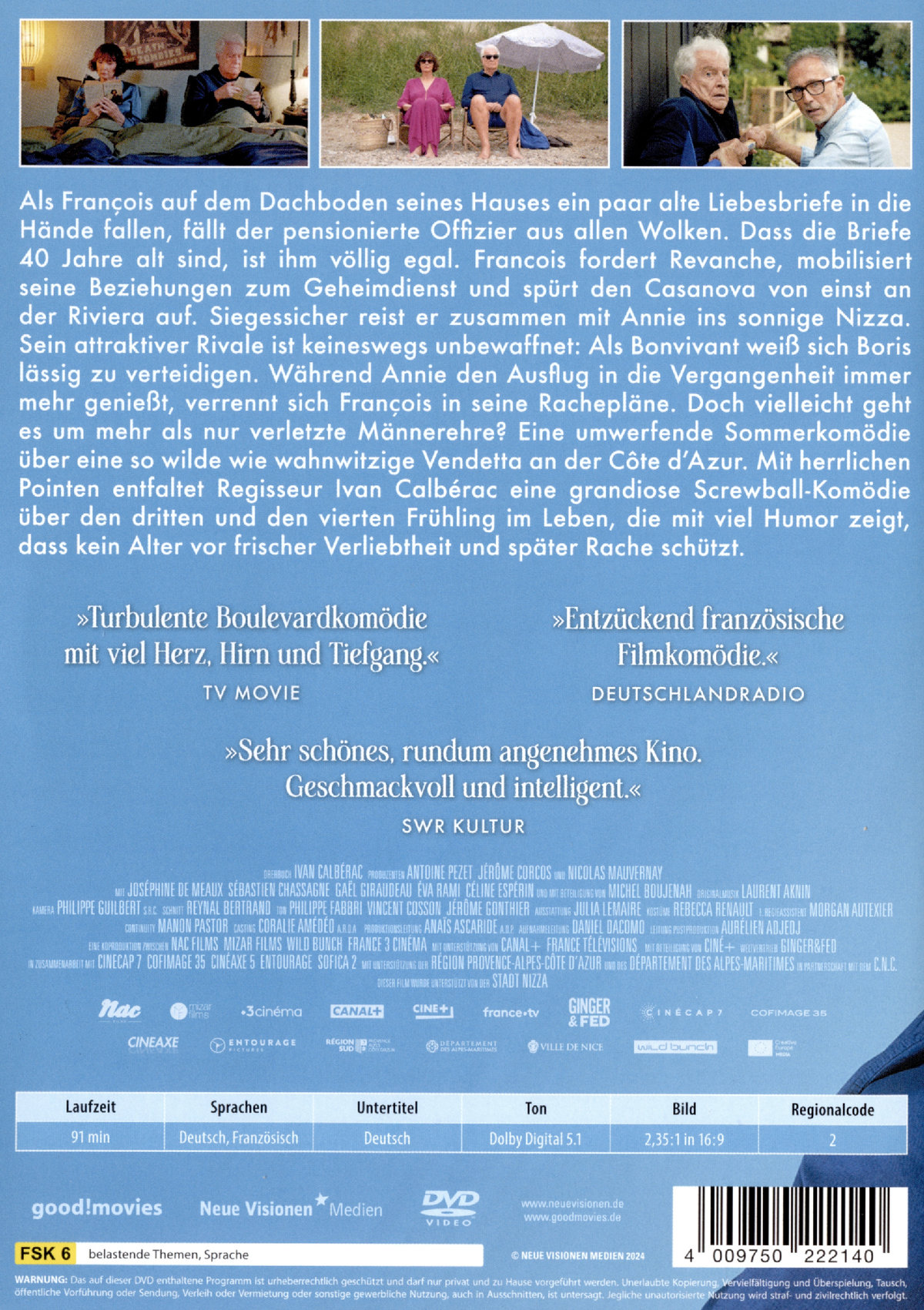 Als François auf dem Dachboden seines Hauses ein paar alte Liebesbriefe in die Hände fallen, fällt der pensionierte Offizier aus allen Wolken. Denn die wortreichen Ergüsse über den „vibrierenden Venushügel“ seiner Frau Annie stammen definitiv nicht von ihm. Dass die Briefe 40 Jahre alt sind und höchstens noch musealen Wert haben, ist ihm völlig egal. Polyamorie in seinem Haus? Undenkbar! Francois fordert Revanche, mobilisiert seine Beziehungen zum Geheimdienst und spürt den Casanova von einst an der Riviera auf. Siegessicher reist er zusammen mit Annie ins sonnige Nizza. Sein attraktiver (und sehr athletischer) Rivale ist keineswegs unbewaffnet: Als Bonvivant und musikalischer Freigeist weiß sich Boris lässig zu verteidigen. Während Annie den Ausflug in die Vergangenheit und das nächtliche Nacktbaden mit ihrem neuen alten Kavalier immer mehr genießt, verrennt sich François in seine Rachepläne. Doch vielleicht geht es um mehr als nur verletzte Männerehre?