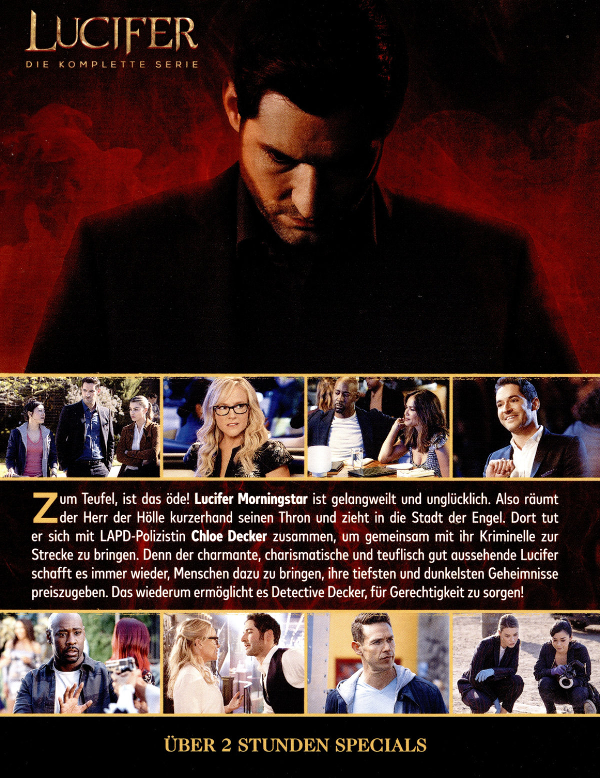 Zum Teufel, ist das öde! Lucifer Morningstar ist gelangweilt und unglücklich. Also räumt der Herr der Hölle kurzerhand seinen Thron und zieht in die Stadt der Engel. Dort tut er sich mit LAPD-Polizistin Chloe Decker zusammen, um gemeinsam mit ihr Kriminelle zur Strecke zu bringen. Denn der charmante, charismatische und teuflisch gut aussehende Lucifer schafft es immer wieder, Menschen dazu zu bringen, ihre tiefsten und dunkelsten Geheimnisse preiszugeben. Das wiederum ermöglicht es Detective Decker, für Gerechtigkeit zu sorgen!Alle 93 Episoden des verbrechenlösenden Teufels in einer Komplettbox!