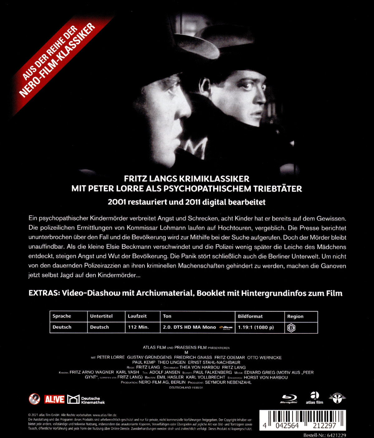 Ein psychopathischer Kindermörder verbreitet Angst und Schrecken, acht Kinder hat er bereits auf dem Gewissen. Die polizeilichen Ermittlungen von Kommissar Lohmann laufen auf Hochtouren, vergeblich. Die Presse berichtet ununterbrochen über den Fall und die Bevölkerung wird zur Mithil-fe bei der Suche aufgerufen. Doch der Mörder bleibt unauffindbar. Als die kleine Elsie Beckmann verschwindet und die Polizei wenig später die Leiche des Mädchens entdeckt, macht sich Angst und Wut in der Bevölkerung breit. Die Panik stört schließlich auch die Berliner Unterwelt. Um nicht von den dauernden Polizeirazzien an ihren kriminellen Machenschaften gehindert zu werden, ma-chen die Ganoven jetzt selbst Jagd auf den Kindermörder... Fritz Langs erster Tonfilm M gehört zu den Meisterwerken der Weimarer Republik. Mit Peter Lorre als psychopathischem Kindermörder hat der Film Geschichte geschrieben. M spiegelt auch das ge-sellschaftliche Klima der Zeit wider und wurde schließlich im Juli 1934 verboten. Der Film wurde 2001 restauriert vom Nederlands Filmmuseum, in Zusammenarbeit mit dem Bundesarchiv, der Cinéma-theque Suisse, KirchMedia und ZDF/Arte und 2011 von TLE Films zum 80. Jahrestag digitalisiert.