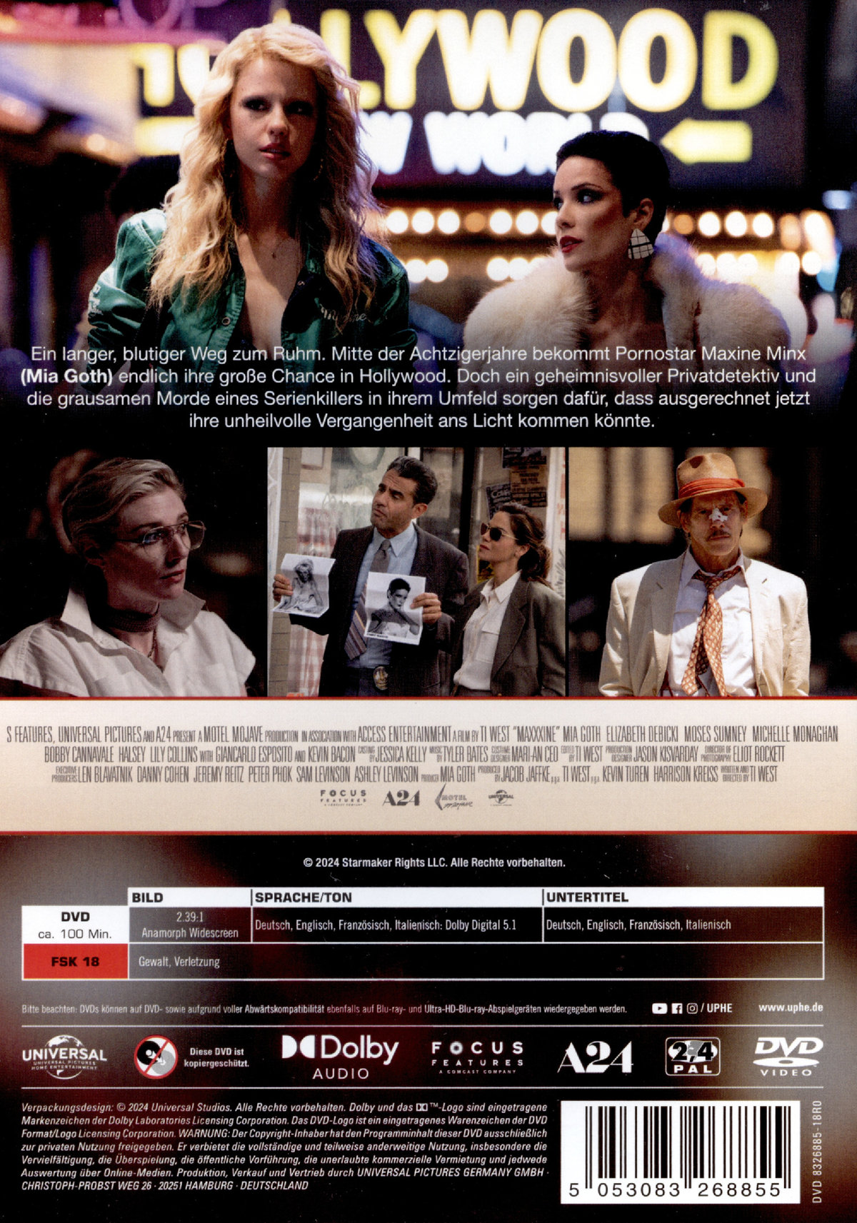 Ein langer, blutiger Weg zum Ruhm. Mitte der Achtzigerjahre bekommt Pornostar Maxine Minx (Mia Goth) endlich ihre große Chance in Hollywood. Doch ein geheimnisvoller Privatdetektiv und die grausamen Morde eines Serienkillers in ihrem Umfeld sorgen dafür, dass ausgerechnet jetzt ihre unheilvolle Vergangenheit ans Licht kommen könnte.Das mörderische Grauen hinter den Schlagzeilen des sogenannten "Texas Pornhouse Massacre", das Maxine (Mia Goth) in X nur knapp überlebt hat, ist für sie nur noch eine düstere Erinnerung im Rückspiegel. Mittlerweile ist sie eine gefragte Porno-Darstellerin und bekommt 1985 sogar die Gelegenheit, den Sprung nach Hollywood zu schaffen und mit einer Hauptrolle im neuen Horrorfilm von Elizabeth Binder (Elizabeth Debicki) endlich ein "echter" Star zu werden. Es ist eine Chance, die sie sich nicht nehmen lassen will - weder vom berüchtigten Serienmörder Night-Stalker, der die Stadt in Angst und Schrecken versetzt, noch von den Ermittlungen eines geheimnisvollen Privatdetektivs (Kevin Bacon) zu ihrer düsteren Vergangenheit.