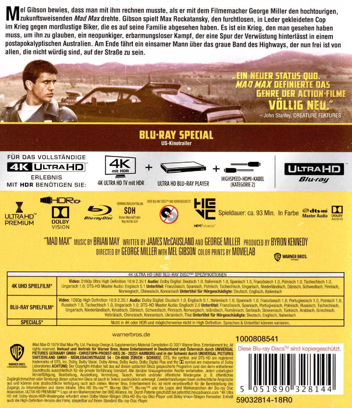 In Zukunft ist die Ordnung zerfallen und die Polizei liefert sich mit den Banden wilde Rennen auf den Highways. Einer der wenigen aufrechten Gesetzeshüter namens Max (Mel Gibson) will, nachdem er bei einer Verfolgungsjagd seinen besten Freund und Kollegen verloren hat, aussteigen und den Dienst quittieren.Er zieht mit seiner Familie durchs Land, bis sie auf den sadistischen Toecutter (Hugh Keays-Byrne) und seine Bande treffen. Sie töten Max' Sohn und verstümmeln seine Frau. Es beginnt ein blutiger Rachefeldzug und "Mad Max" wird nicht ruhen, ehe er nicht den Letzten von ihnen getötet hat.Enthält 4K Ultra HD & Blu-ray.