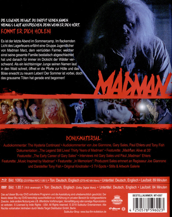 Die Legende besagt, Du darfst seinen Namen niemals laut aussprechen, denn wenn er Dich hört, kommt er Dich holen! Es ist der letzte Abend im Sommercamp. Im flackernden Licht des Lagerfeuers erfährt eine Gruppe Jugendlicher von Madman Marz, dem verrückten Farmer, welcher einst seine gesamte Familie bestialisch abgeschlachtet hat und danach für immer im Dickicht der Wälder verschwand. Als ein leichtsinniger Junge seinen Namen laut in den Wald schreit, öffnet er die Pforte zur Hölle und das Böse erwacht zu neuem Leben! Der Sommer ist vorbei, doch das grausame Töten hat gerade erst begonnen! Bildformat: 1,85:1 (BD: 1080p/23.976fps/AVC/1.85:1) – (DVD = 16:9 anamorph) Tonformat: Deutsch + Englisch DTS-HD MA Mono / (DVD = Dolby Digital Mono)