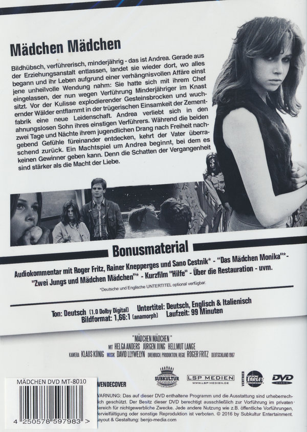 Audiokommentar von Roger Fritz, Rainer Knepperges und Sano Cestnik;"Das Mädchen Monika"; "Zwei Jungs und Mädchen Mädchen" ;Kurzfilm "Hilfe" ;Restaurationsvergleich;
