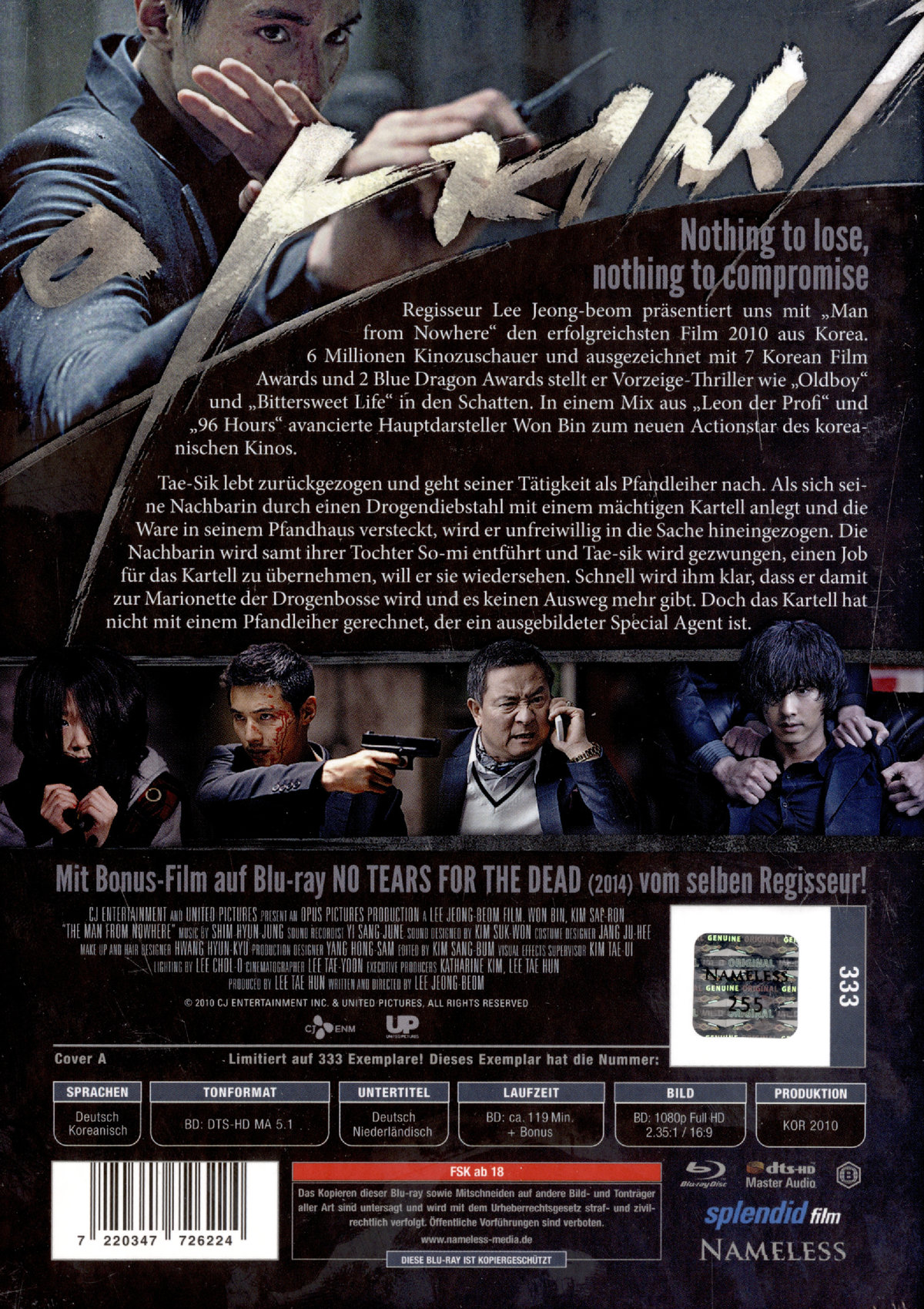 Inhalt: Regisseur Lee Jeong-beom präsentiert uns mit "Man from Nowhere" den erfolgreichsten Film 2010 aus Korea. 6 Millionen Kinozuschauer und ausgezeichnet mit 7 Korean Film Awards und 2 Blue Dragon Awards stellt er Vorzeige-Thriller wie "Oldboy" und "Bittersweet Life" in den Schatten. In einem Mix aus "Leon der Profi" und "96 Hours" avancierte Hauptdarsteller Won Bin zum neuen Actionstar des koreanischen Kinos. Tae-Sik lebt zurückgezogen und geht seiner Tätigkeit als Pfandleiher nach. Als sich seine Nachbarin durch einen Drogendiebstahl mit einem mächtigen Kartell anlegt und die Ware in seinem Pfandhaus versteckt, wird er unfreiwillig in die Sache hin-eingezogen. Die Nachbarin wird samt ihrer Tochter So-mi entführt und Tae-sik wird gezwungen, einen Job für das Kartell zu übernehmen, will er sie wiedersehen. Schnell wird ihm klar, dass er damit zur Marionette der Drogenbosse wird und es keinen Ausweg mehr gibt. Doch das Kartell hat nicht mit einem Pfandleiher gerechnet, der ein ausgebildeter Special Agent ist.