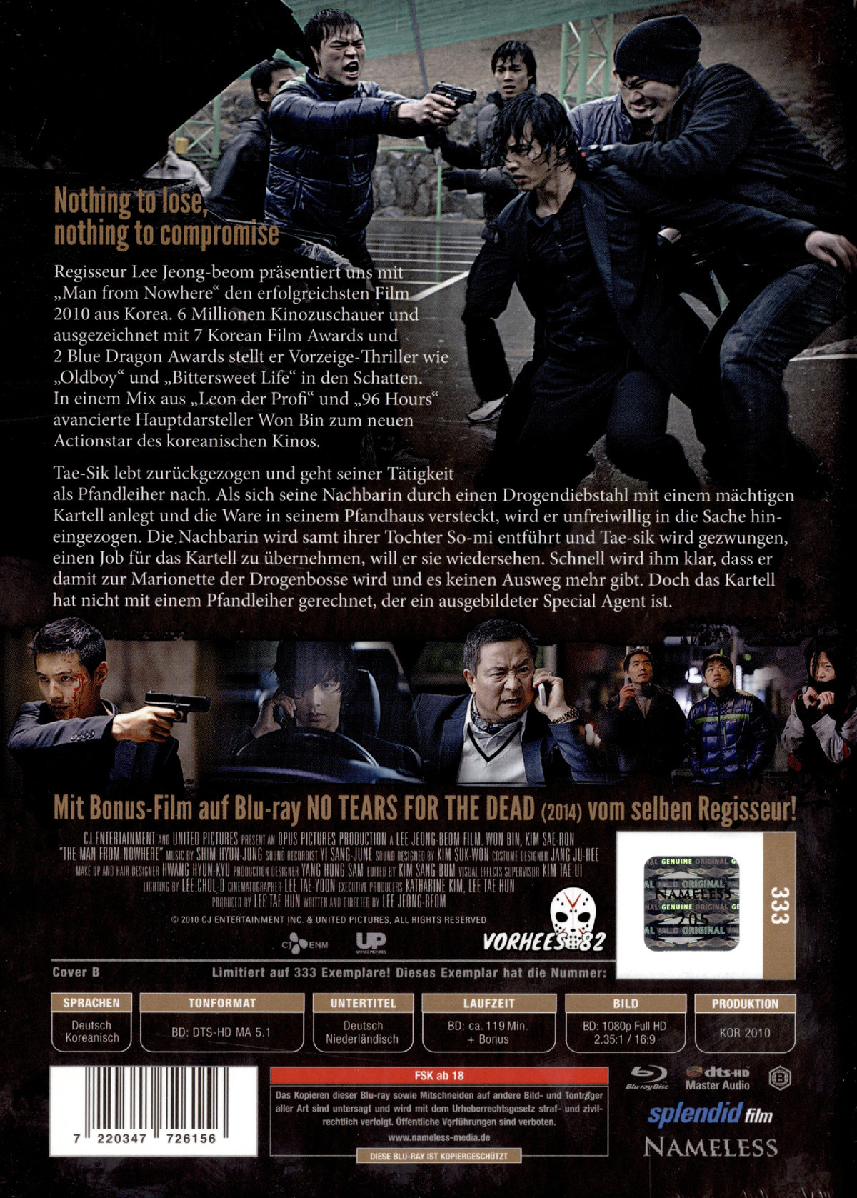 Inhalt: Regisseur Lee Jeong-beom präsentiert uns mit "Man from Nowhere" den erfolgreichsten Film 2010 aus Korea. 6 Millionen Kinozuschauer und ausgezeichnet mit 7 Korean Film Awards und 2 Blue Dragon Awards stellt er Vorzeige-Thriller wie "Oldboy" und "Bittersweet Life" in den Schatten. In einem Mix aus "Leon der Profi" und "96 Hours" avancierte Hauptdarsteller Won Bin zum neuen Actionstar des koreanischen Kinos. Tae-Sik lebt zurückgezogen und geht seiner Tätigkeit als Pfandleiher nach. Als sich seine Nachbarin durch einen Drogendiebstahl mit einem mächtigen Kartell anlegt und die Ware in seinem Pfandhaus versteckt, wird er unfreiwillig in die Sache hin-eingezogen. Die Nachbarin wird samt ihrer Tochter So-mi entführt und Tae-sik wird gezwungen, einen Job für das Kartell zu übernehmen, will er sie wiedersehen. Schnell wird ihm klar, dass er damit zur Marionette der Drogenbosse wird und es keinen Ausweg mehr gibt. Doch das Kartell hat nicht mit einem Pfandleiher gerechnet, der ein ausgebildeter Special Agent ist.
