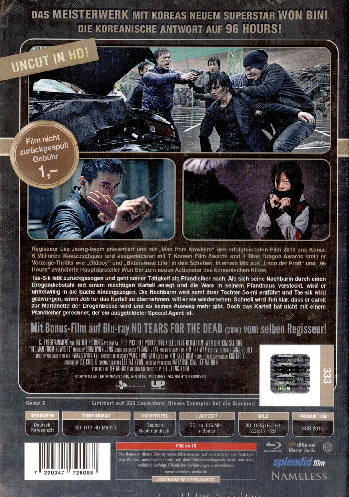 Inhalt: Regisseur Lee Jeong-beom präsentiert uns mit "Man from Nowhere" den erfolgreichsten Film 2010 aus Korea. 6 Millionen Kinozuschauer und ausgezeichnet mit 7 Korean Film Awards und 2 Blue Dragon Awards stellt er Vorzeige-Thriller wie "Oldboy" und "Bittersweet Life" in den Schatten. In einem Mix aus "Leon der Profi" und "96 Hours" avancierte Hauptdarsteller Won Bin zum neuen Actionstar des koreanischen Kinos. Tae-Sik lebt zurückgezogen und geht seiner Tätigkeit als Pfandleiher nach. Als sich seine Nachbarin durch einen Drogendiebstahl mit einem mächtigen Kartell anlegt und die Ware in seinem Pfandhaus versteckt, wird er unfreiwillig in die Sache hin-eingezogen. Die Nachbarin wird samt ihrer Tochter So-mi entführt und Tae-sik wird gezwungen, einen Job für das Kartell zu übernehmen, will er sie wiedersehen. Schnell wird ihm klar, dass er damit zur Marionette der Drogenbosse wird und es keinen Ausweg mehr gibt. Doch das Kartell hat nicht mit einem Pfandleiher gerechnet, der ein ausgebildeter Special Agent ist.