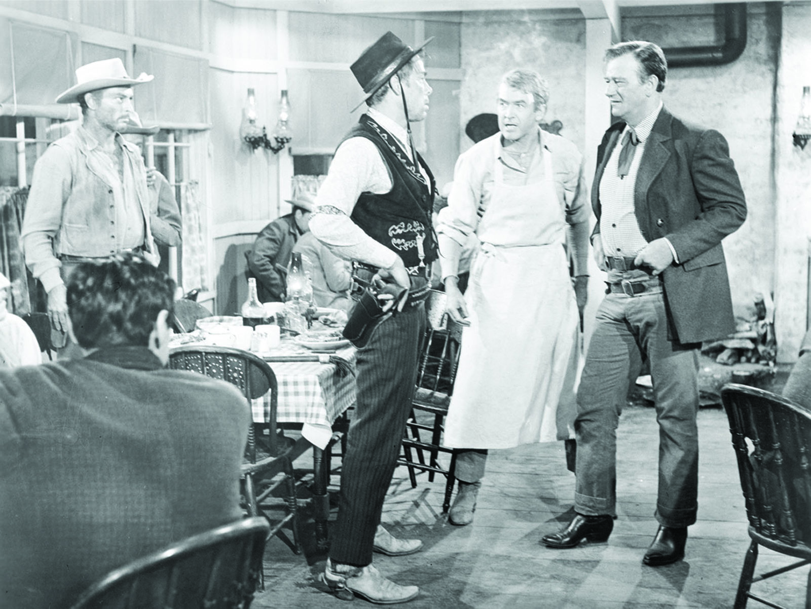 Der Titelheld wird von dem größten Star gespielt, der jemals mit einem sechsschüssigen Revolver feuerte: John Wayne. Die beiden Gegenspieler, der aufrichtige Stewart und der raue Rancher Wayne, konkurrieren um die Liebe zur selben Frau. Am Ende rechnet der eine zwar mit dem Schurken ab, der andere jedoch bekommt das Mädchen.