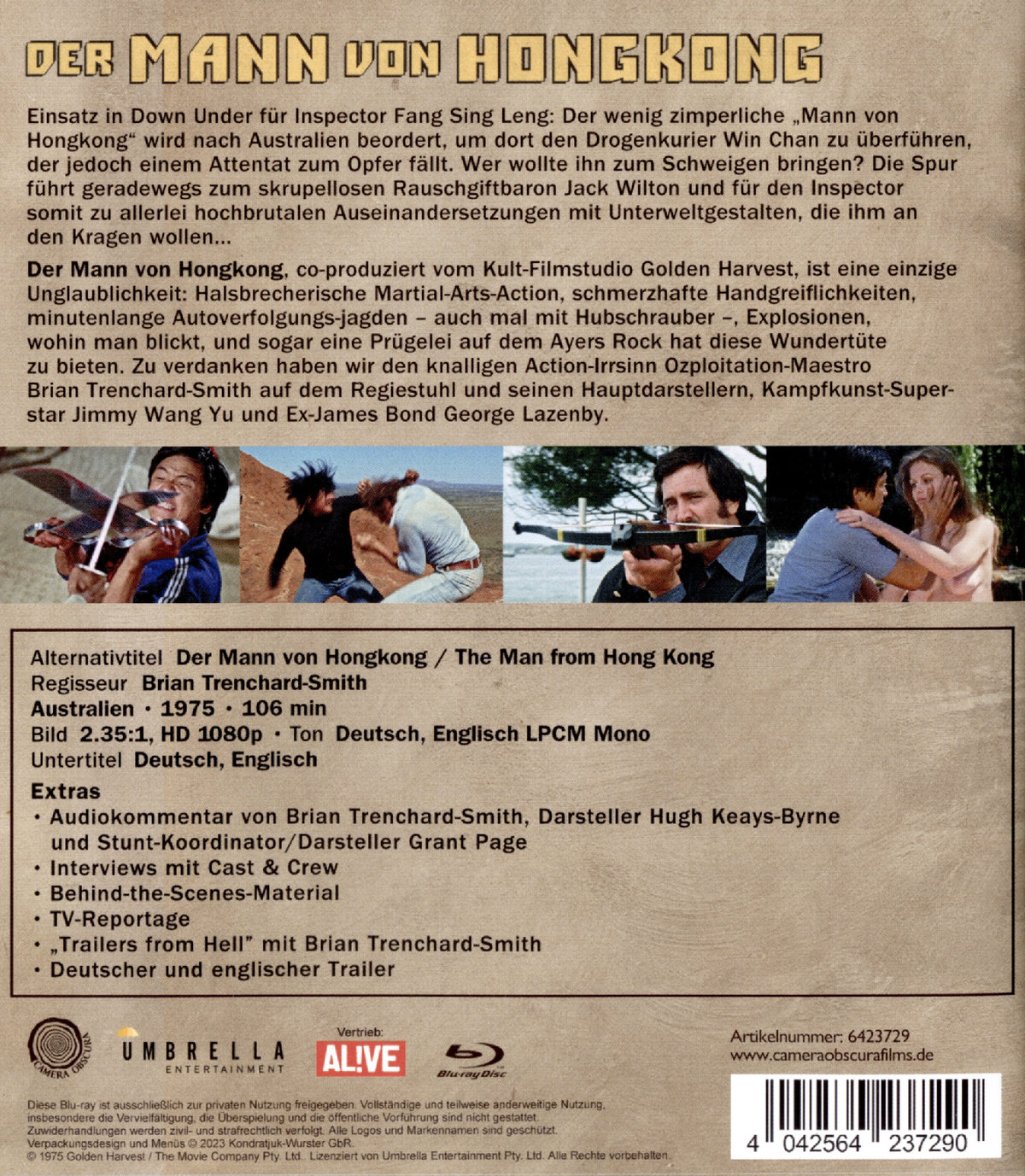Einsatz in Down Under für Inspector Fang Sing Leng: Der wenig zimperliche „Mann von Hongkong“ wird nach Australien beordert, um dort den Drogenkurier Win Chan zu überführen, der jedoch einem Attentat zum Opfer fällt. Wer wollte ihn zum Schweigen bringen? Die Spur führt geradewegs zum skrupellosen Rauschgiftbaron Jack Wilton und für den Inspector somit zu allerlei hochbrutalen Auseinandersetzungen mit Unterweltgestalten, die ihm an den Kragen wollen... DER MANN VON HONGKONG, co-produziert vom Kult-Filmstudio Golden Harvest, ist eine einzige Unglaublichkeit: Halsbrecherische Martial-Arts-Action, schmerzhafte Handgreiflichkeiten, minutenlange Autoverfolgungsjagden – auch mal mit Hubschrauber –, Explosionen, wohin man blickt, und sogar eine Prügelei auf dem Ayers Rock hat diese Wundertüte zu bieten. Zu verdanken haben wir den knalligen Action-Irrsinn Ozploitation-Maestro Brian Trenchard-Smith auf dem Regiestuhl und seinen Hauptdarstellern, Kampfkunst-Superstar Jimmy Wang Yu und Ex-James Bond George Lazenby.