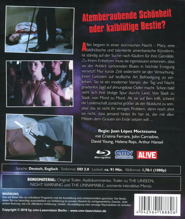 Alles begann in einer stürmischen Nacht - Mary, eine bildhübsche und talentierte amerikanische Künstlerin, ist ständig auf der Suche nach Käufern für ihre Gemälde. Zu ihrem Entsetzen muss sie irgendwann erkennen, dass sie der Anblick spritzenden Blutes in höchste Erregung versetzt! Nur kurze Zeit widersteht sie der Versuchung, ihren Gelüsten auf teuflische Art Befriedigung zu verleihen. Sie ist ein moderner Vampir, der Tag und Nacht gnadenlos Jagd auf ahnungslose Opfer macht. Schon bald zieht sich ihre blutige Spur durchs Land. Von Stadt zu Stadt, von Mord zu Mord. Als sie auf Ben trifft, scheint die Leidenschaft zunächst größer als der Blutdurst zu sein, aber das ist nicht ihr einziges Problem, denn noch ahnt sie nicht, dass jemand hinter ihr her ist, der mit allen Mitteln dem Grauen ein Ende setzen will...