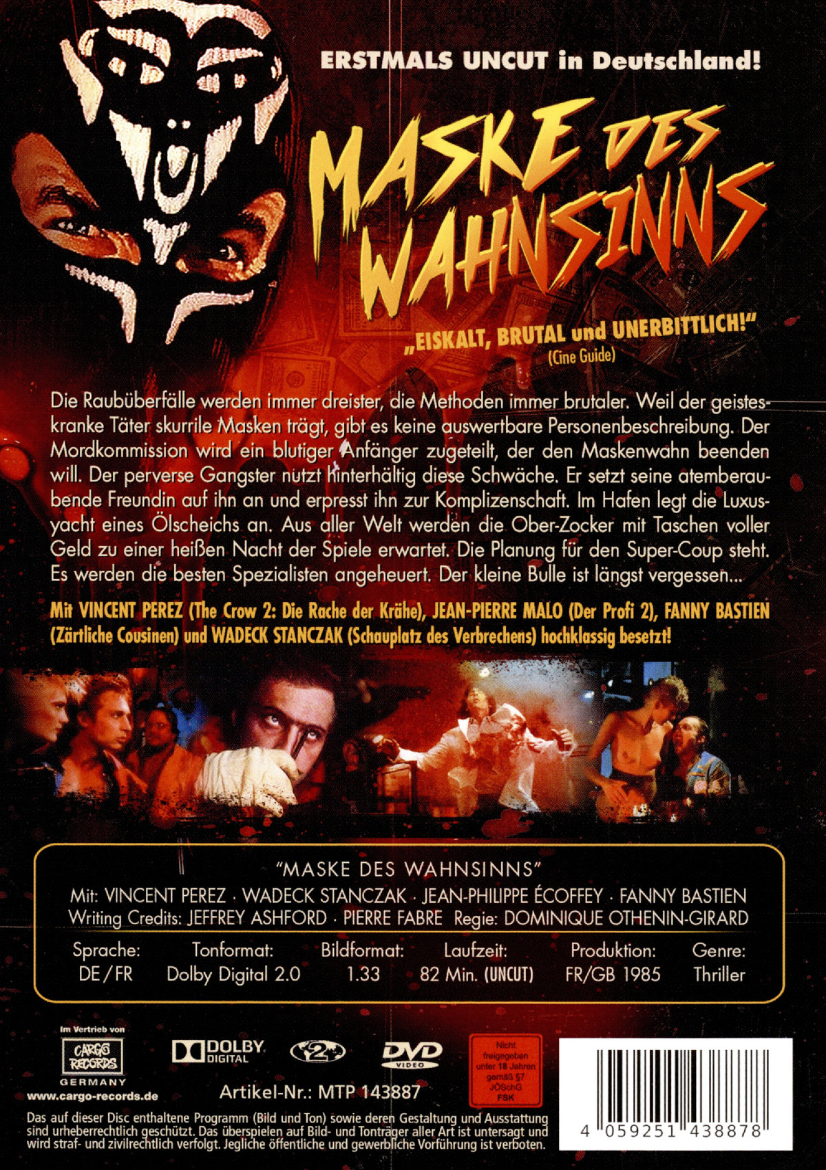 Die Raubüberfälle werden immer dreister, die Methoden immer brutaler. Weil der Täter skurrile Masken trägt, gibt es keine auswertbare Personenbeschreibung. Der Mordkommission wird ein blutiger Anfänger zugeteilt. Der Gangster nutzt hinterhältig diese Schwäche. Er setzt seine atemberaubende Freundin auf ihn an und erpresst ihn zur Komplizenschaft.