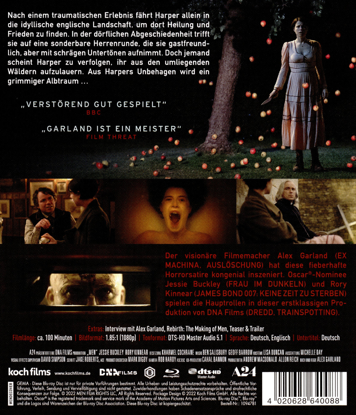 Der visionäre Filmemacher Alex Garland (EX MACHINA, AUSLÖSCHUNG) hat diese fieberhafte Horrorsatire kongenial inszeniert. Oscar®-Nominee Jessie Buckley (FRAU IM DUNKELN) und Rory Kinnear (JAMES BOND 007: KEINE ZEIT ZU STERBEN) spielen die Hauptrollen in dieser erstklassigen Produktion von DNA Films (DREDD, TRAINSPOTTING).