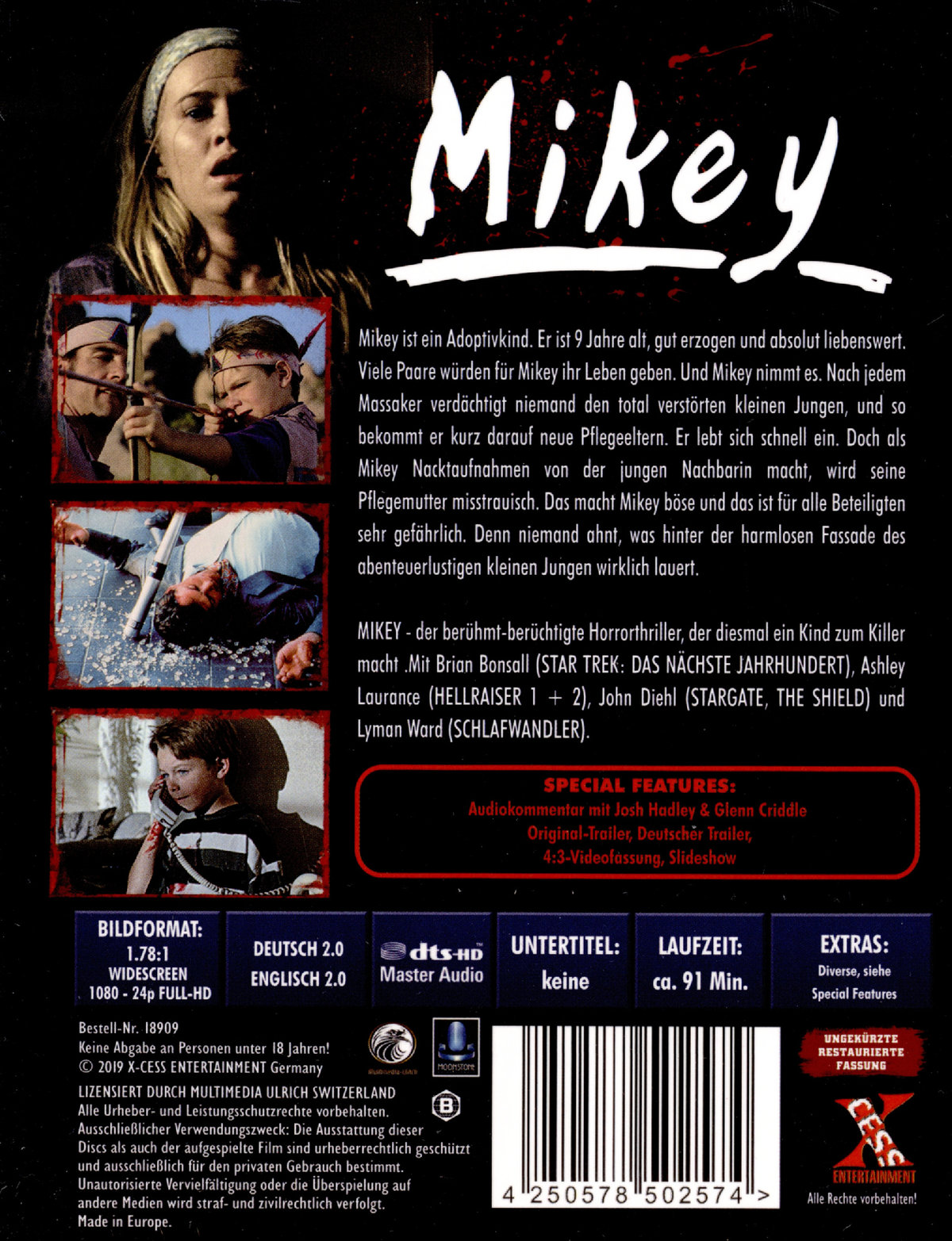 MIKEY - der berühmt-berüchtigte Horrorthriller, der diesmal ein Kind zum Killer macht - liegt hiermit erstmals in HD vor. Mit Brian Bonsall (STAR TREK: DAS NÄCHSTE JAHRHUNDERT), Ashley Laurance (HELLRAISER 1 + 2), John Diehl (STARGATE, THE SHIELD) und Lyman Ward (SCHLAFWANDLER).