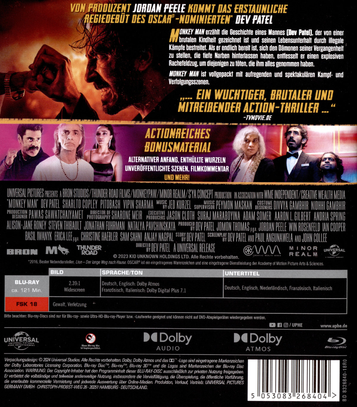 Ein winziger Funke kann alles entfachen"Monkey Man" erzählt die Geschichte eines Mannes, der von einer brutalen Kindheit gezeichnet ist und seinen Lebensunterhalt durch illegale Kämpfe bestreitet. Als er endlich bereit ist, sich den Dämonen seiner Vergangenheit zu stellen, die tiefe Narben hinterlassen haben, entfesselt er einen explosiven Rachefeldzug, um diejenigen zu töten, die ihm alles genommen haben."Monkey Man" ist vollgepackt mit aufregenden und spektakulären Kampf- und Verfolgungsszenen.