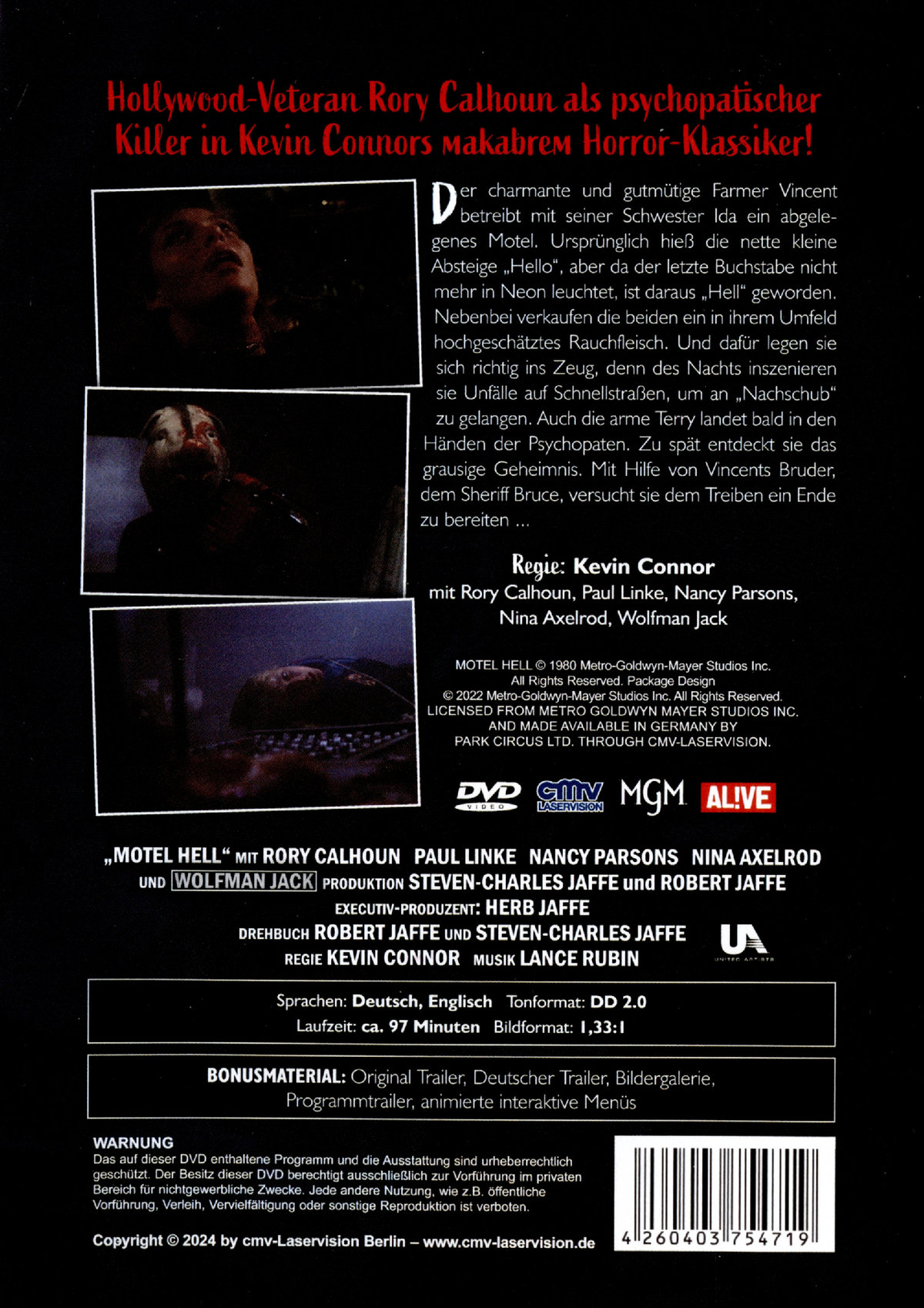 Der charmante und gutmütige Farmer Vincent betreibt mit seiner Schwester Ida ein abgelegenes Motel. Ursprünglich hieß die nette kleine Absteige "Hello", aber da der letzte Buchstabe nicht mehr in Neon leuchtet, ist daraus "Hell" geworden. Nebenbei verkaufen die beiden ein in ihrem Umfeld hochgeschätztes Rauchfleisch. Und dafür legen sie sich richtig ins Zeug, denn des Nachts inszenieren sie Unfälle auf Schnellstraßen, um an "Nachschub" zu gelangen. Auch die arme Terry landet bald in den Händen der Psychopaten. Zu spät entdeckt sie das grausige Geheimnis. Mit Hilfe von Vincents Bruder, dem Sheriff Bruce, versucht sie dem Treiben ein Ende zu bereiten ... Hollywood-Veteran Rory Calhoun spielt einen psychopatischen Killer der Spitzenklasse in Kevin Connors makabrem Horror-Thriller!