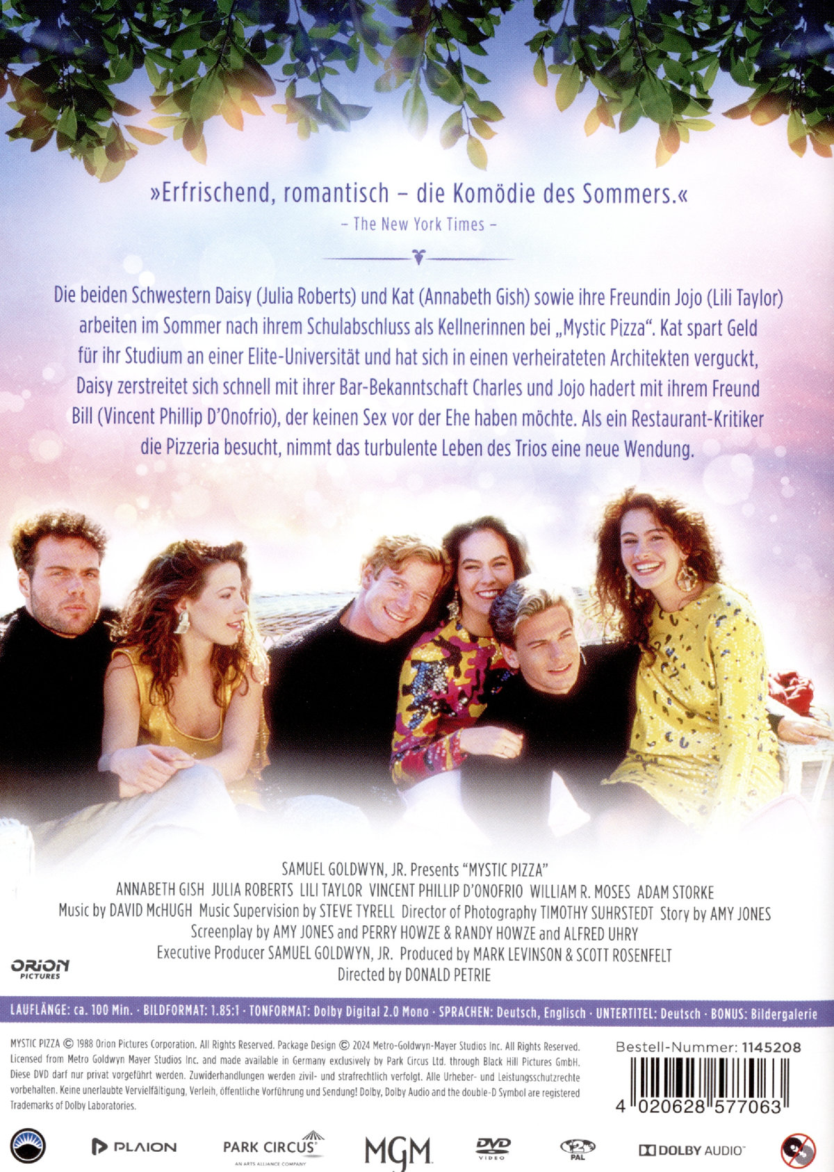 Die beiden Schwestern Daisy (Julia Roberts) und Kat (Annabeth Gish) sowie ihre Freundin Jojo (Lili Taylor) arbeiten im Sommer nach ihrem Schulabschluss als Kellnerinnen bei "Mystic Pizza". Kat spart Geld für ihr Studium an einer Elite-Universität und hat sich in einen verheirateten Architekten verguckt, Daisy zerstreitet sich schnell mit ihrer Bar-Bekanntschaft Charles, Jojo hadert mit ihrem Freund Bill (Vincent D'Onofrio), der keinen Sex vor der Ehe haben möchte. Als ein Restaurant-Kritiker die Pizzeria besucht, nimmt das turbulente Leben des Trios eine neue Wendung. Daisy, ihre Schwester Kat sowie Freundin Jojo arbeiten im Sommer nach ihrem Schulabschluss als Kellnerinnen bei "Mystic Pizza". Nachdem sie von Männern enttäuscht wurden, besucht ein Restaurant-Kritiker das Lokal - und verleiht damit auch dem Leben der drei Frauen eine entscheidende Wendung. Rundes Jubiläum: Vor 35 Jahren lief die romantische Komödie "Mystic Pizza" in den deutschen Kinos an. Es war die erste Kino-Hauptrolle von Superstar und OSCAR®-Preisträgerin Julia Roberts ("Erin Brockovich").