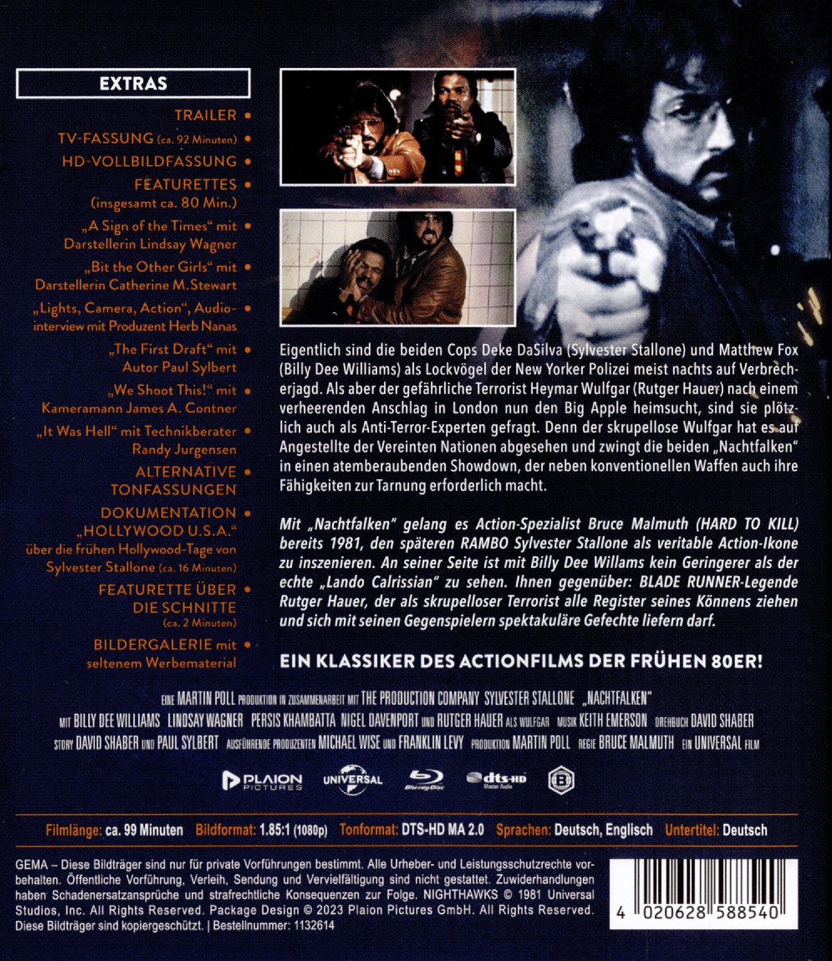 Mit NACHTFALKEN gelang es Action-Spezialist Bruce Malmuth (HARD TO KILL) bereits 1981, den späteren RAMBO Sylvester Stallone als veritable Action-Ikone zu inszenieren. An seiner Seite ist mit Billy Dee Willams kein Geringerer als der echte "Lando Calrissian" zu sehen. Ihnen gegenüber: BLADE RUNNER-Legende Rutger Hauer, der als skrupelloser Terrorist alle Register seines Könnens ziehen und sich mit seinen Gegenspielern spektakuläre Gefechte liefern darf.