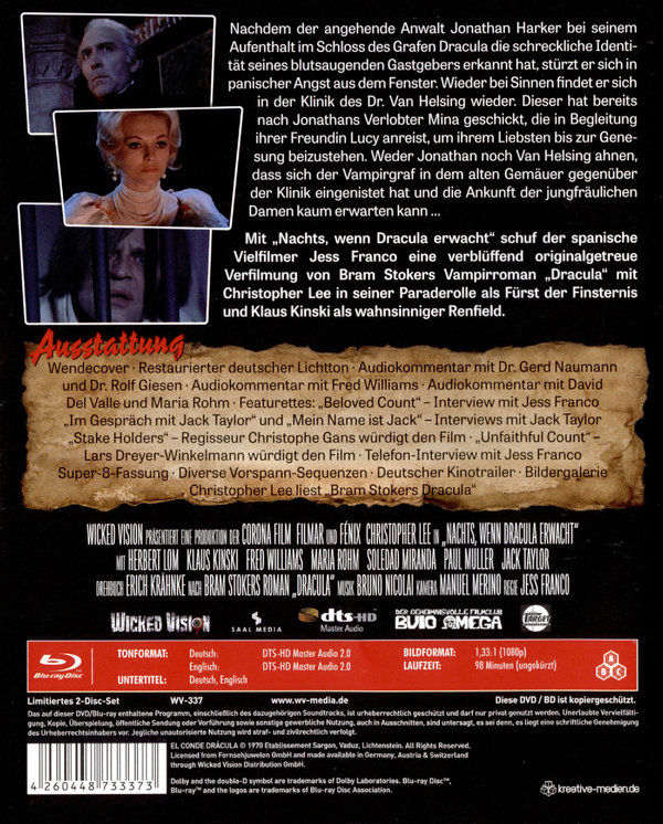 Mit „Nachts, wenn Dracula erwacht“ schuf der spanische Vielfilmer Jess Franco eine verblüffend originalgetreue Verfilmung von Bram Stokers Vampirroman „Dracula“ mit Christopher Lee in seiner Paraderolle als Fürst der Finsternis und Klaus Kinski als wahnsinniger Renfield. Erlebt diesen Klassiker als europäische HD-Premiere, digital remastered und mit knapp 15 Stunden an umfangreichem Bonusmaterial.