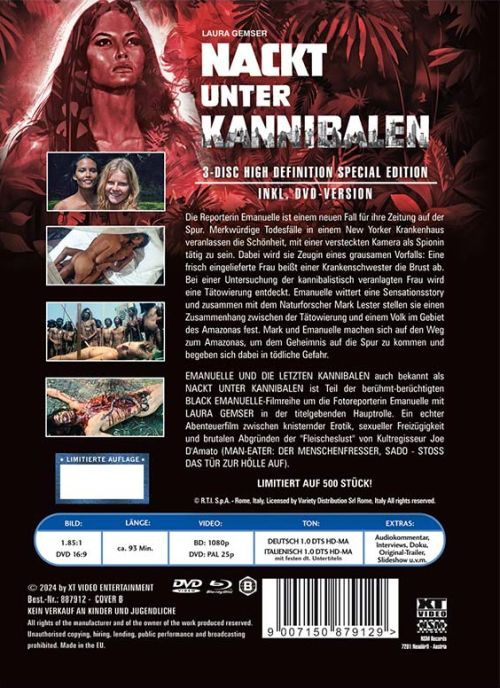 EMANUELLE UND DIE LETZTEN KANNIBALEN auch bekannt als NACKT UNTER KANNIBALEN ist Teil der berühmt-berüchtigten BLACK EMANUELLE-Filmreihe um die Fotoreporterin Emanuelle mit LAURA GEMSER in der titelgebenden Hauptrolle. Ein echter Abenteuerfilm zwischen knisternder Erotik, sexueller Freizügigkeit und brutalen Abgründen der "Fleischeslust" von Kultregisseur Joe D'Amato (MAN-EATER: DER MENSCHENFRESSER, SADO - STOSS DAS TÜR ZUR HÖLLE AUF).