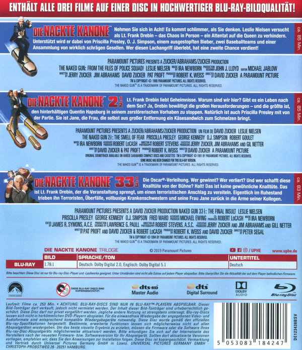Die nackte KanoneNehmen Sie sich in Acht! Es kommt schlimmer, als Sie denken. Leslie Nielsen versucht als Lt. Frank Drebin – das Chaos in Person – ein Attentat auf die Queen zu verhindern. Unterstützt wird er dabei von Priscilla Presley, O. J. Simpson, einem ausgestopften Bieber, zwei Baseballteams und einer Ansammlung von wirklich schrägen Gesellen. Wer diesen Lachangriff überlebt, hat eine zweite Chance verdient! Die nackte Kanone 2 1/2Lt. Frank Drebin liebt Geheimnisse. Warum sind wir hier? Gibt es ein Leben nach dem Sex? Ja, Drebin bewältigt die großen Herausforderungen – und die größte ist, den hinterhältigen Quentin Hapsburg in seinem zerstörerischen Vorhaben zu stoppen. Natürlich ist auch Priscilla Presley mit von der Partie. Sie ist Jane, die Frau, die selbst aus großer Entfernung ein Käsesandwich zum Schmelzen bringt. Das wird ein Kräftemessen für Ihre Lachmuskeln. Aber Sie lieben doch wie Drebin die wirklich großen Herausforderungen, oder? Die nackte Kanone 33 1/3Die Oscar®-Verleihung. Wer gewinnt? Wer verliert? Und wer schafft diese Knalltüte von der Bühne? Halt! Das ist keine gewöhnliche Knalltüte. Das ist Lt. Frank Drebin, der die Veranstaltung sprengt, um einen terroristischen Anschlag zu vereiteln. Eigentlich im Ruhestand – trieben ihn Terroristen, Überfälle, vollbusige Krankenschwestern und seine Frau Jane...