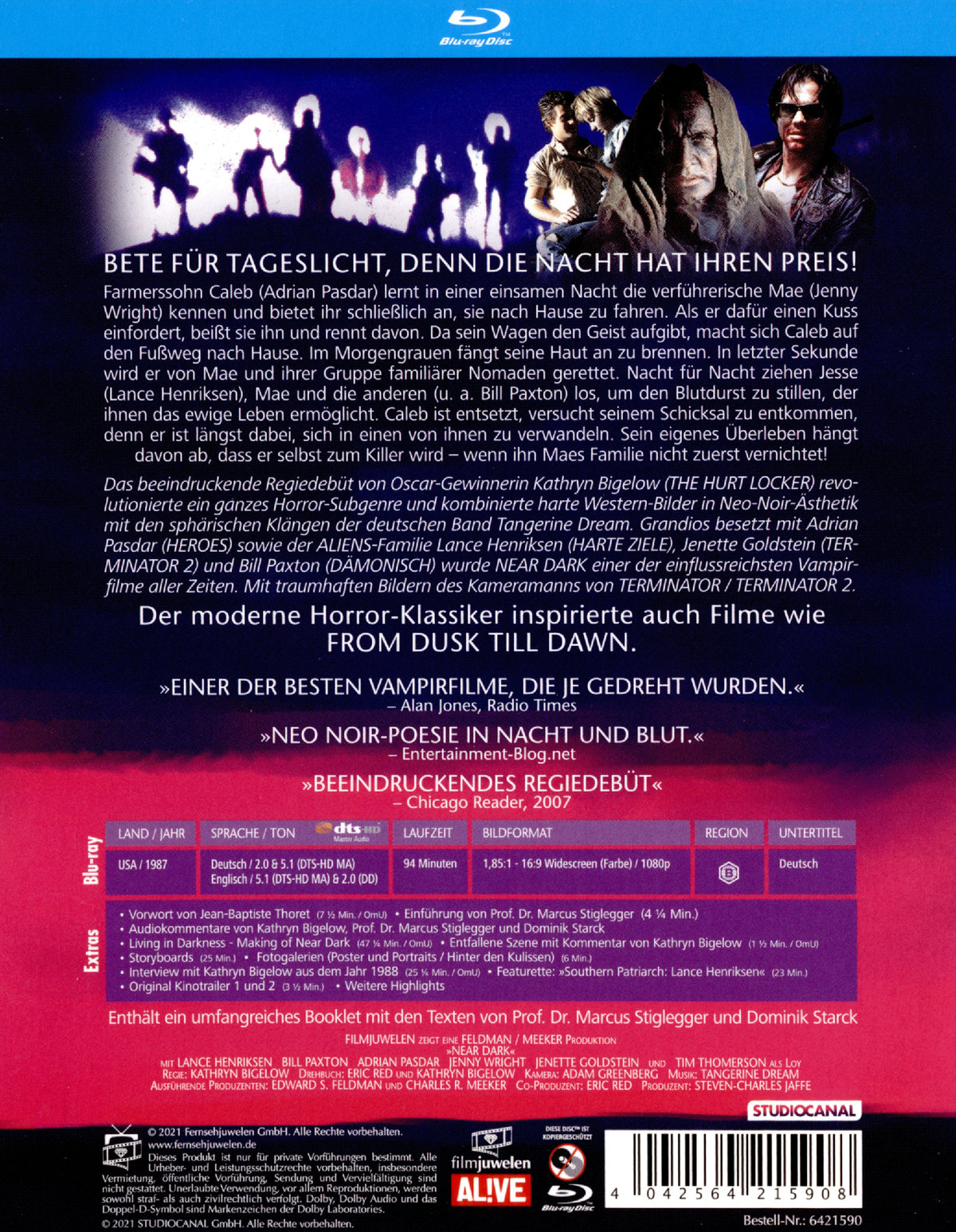 Das beeindruckende Regiedebüt von Oscar-Gewinnerin Kathryn Bigelow ("The Hurt Locker") revolutionierte ein ganzes Horror-Subgenre und kombinierte harte Western-Bilder in Neo-Noir-Ästhetik mit den sphärischen Klängen der deutschen Band Tangerine Dream. Grandios besetzt mit Adrian Pasdar ("Heroes") sowie der ALIENS-Familie Lance Henriksen ("Harte Ziele"), Jenette Goldstein ("Terminator 2") und Bill Paxton ("Dämonisch") wurde "Near Dark" einer der einflussreichsten Vampirfilme aller Zeiten.