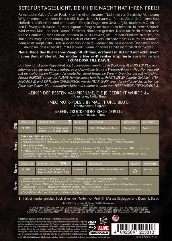Das beeindruckende Regiedebüt von Oscar-Gewinnerin Kathryn Bigelow ("The Hurt Locker") revolutionierte ein ganzes Horror-Subgenre und kombinierte harte Western-Bilder in Neo-Noir-Ästhetik mit den sphärischen Klängen der deutschen Band Tangerine Dream. Grandios besetzt mit Adrian Pasdar ("Heroes") sowie der ALIENS-Familie Lance Henriksen ("Harte Ziele"), Jenette Goldstein ("Terminator 2") und Bill Paxton ("Dämonisch") wurde "Near Dark" einer der einflussreichsten Vampirfilme aller Zeiten.