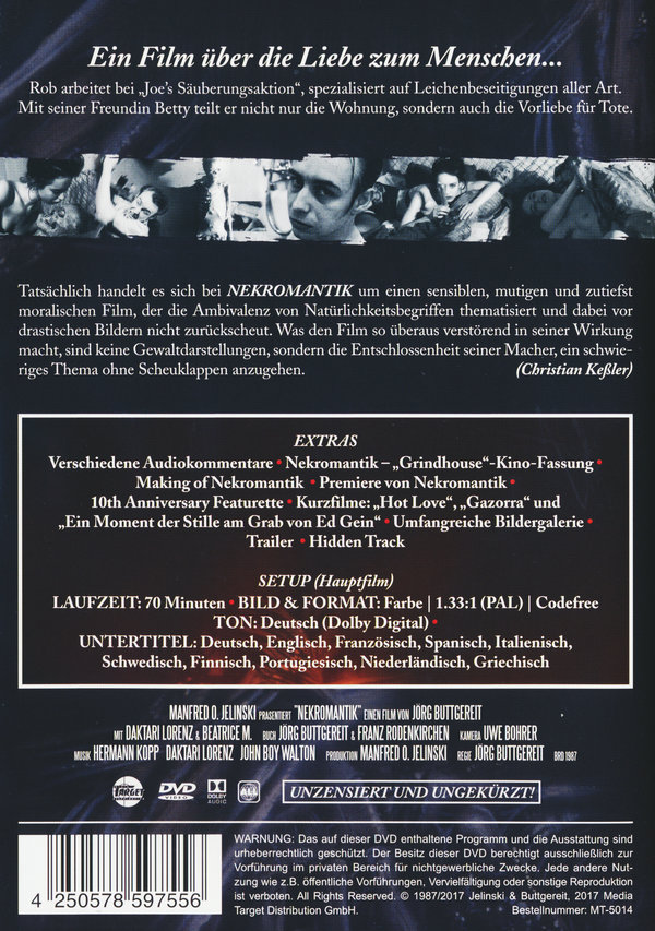 NEKROMANTIK: wenn man den Titel wörtlich nimmt, ist man der Essenz des Films am nächsten: nekrophil und romantisch. Doch nach allgemein menschlichem Empfinden schließt das eine das andere aus. Aus dieser Voraussetzung ergibt sich eine Verschiebung, die aus der Differenz zwischen dem entsteht, was den Zuschauer entsetzt und mit Ekel erfüllt, aber die Figuren des Films für das Allergewöhnlichste nehmen. Aus der Kluft zwischen den Gefühlen innerhalb und außerhalb des Films resultiert eine Art von Humor, die erlösend ist, ohne aber das Unglaubliche zu relativieren. Er bietet eine Chance, die man als Zuschauer nutzen kann, wenn man sich nicht zu helfen weiß. (Anke Sterneborg)