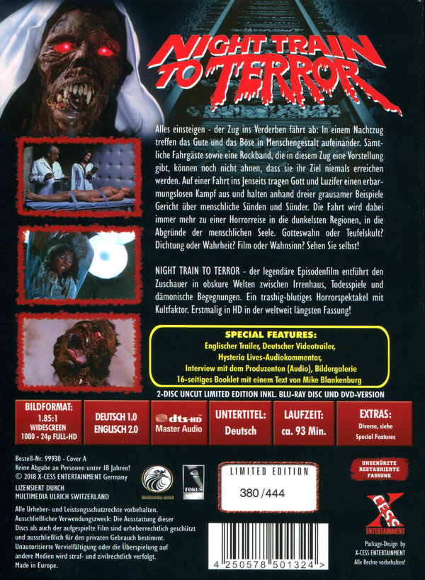 Auf 444 Stück limitiertes und nummeriertes Mediabook;Deutsche HD Premiere in der weltweit längsten Fassung;16-seitiges Booklet mit einem Text von Mike Blankenburg;Interview mit dem Produzenten (Audio);Hysteria Lives;Audiokommentar;Deutscher Videotrailer;Englischer Trailer;Bildergalerie;DVD-Version:DD 2.0 Deutsch/Englisch;Zusatzinfo: NIGHT TRAIN TO TERROR - der legendäre Episodenfilm entführt den Zuschauer in obskure Welten zwischen Irrenhaus, Todesspiele und dämonische Begegnungen. Ein trashig-blutiges Horrorspektakel mit Kultfaktor. Erstmalig in HD in der weltweit längsten Fassung!;