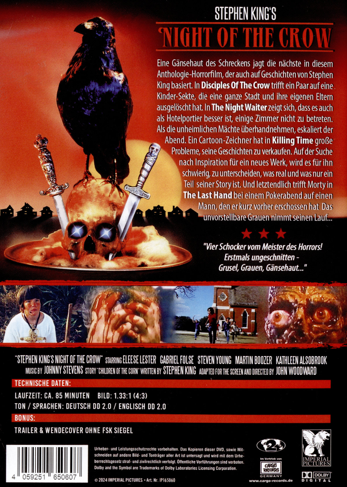 Eine Gänsehaut des Schreckens jagt die nächste... Erstmalig UNCUT in DVD Qualität mit allen 4 Episoden in Deutsch und in Englisch Handlung Disciples Of The Crow Die erste Adaption von Stephen King's Kinder des Zorns. Ein Paar, deren Durchreise durch eine kleine Stadt in Oklahoma führt, entdeckt, dass diese von einer mörderischen Sekte übernommen wurde, die einen Krähengott verehrt. Alle Sektenmitglieder sind Kinder, die Ihre Eltern bereits getötet haben. The Night Waiter Ein junger Mann wird als neuer Zimmerservice-Kellner im Bay View Hotel eingestellt und gerät in Konflikt mit dem Nachtportier, der seine Unerfahrenheit schamlos ausnutzt. Als die unheimlichen Mächte, die das Hotel eingenommen haben überhandnehmen eskaliert der Abend. Killing Time Ein Cartoon-Zeichner hat Probleme, seine Geschichten zu verkaufen. Auf der Suche nach Inspiration für ein neues Werk, wird es für ihn immer schwieriger, sich von dem zu unterscheiden, was real ist und was nur ein Teil seiner Geschichte ist. The Last Hand Morty erleidet im Parkhaus fast einen Herzinfarkt und erschiesst in seiner Benommenheit einen Mann. Trotzdem geht er zu seiner Poker-Spielrunde, aber der scheinbar ermordete Mann ist unversehrt und nimmt ebenfalls teil. Beide tun so als sei nichts geschehen, doch im Laufe des Abends wird Morty zunehmend immer unruhiger und beginnt zu halluzinieren. Das unvorstellbare Grauen nimmt seinen Lauf...