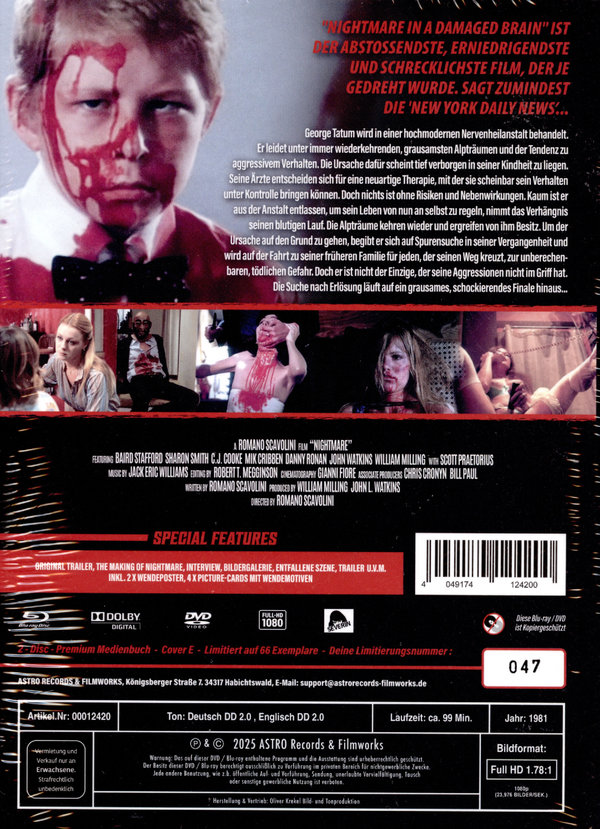 Er wurde indiziert. Er wurde sogar beschlagnahmt. Er wurde als „grafisch und unapologetisch“ (SexGoreMutants), „brutal effektiv“ (Screen Rant) und „ein vergessener Klassiker“ (Horror News) bezeichnet. Er ist nach wie vor der am meisten geschmähte, umstrittenste und missverstandenste Genrefilm der 80er Jahre. Jetzt kann man „den abstoßendsten, erniedrigendsten und schrecklichsten Film, der je gedreht wurde“ (NY Daily News) in neuer Qualität, so gut und so vollständig wie nie zuvor erleben. In 4K vom Internegativ abgetastet, sowie von anderen, verschiedenen ausländischen Quellen Remastered, bietet unsere Blu-ray ein unglaublich scharfes und detailreiches Bild, welches noch dazu die vollständigste Version die jemals zusammengestellt wurde päsentiert. Als ein geisteskranker Mörder (eine nachhaltig verstörende Leistung von Baird Stafford) aus einem experimentellen Drogenprogramm flieht, hinterlässt er eine fünftägige Spur psychosexuellen Gemetzels von den Peepshows der 42. Straße bis zu den blutgetränkten Ufern Floridas. Dieses „verheerende Meisterwerk“ (Cinefear) – dessen Veröffentlichung im Vereinigten Königreich unter dem Titel NIGHTMARES IN A DAMAGED BRAIN zur Inhaftierung des Verleihers David Hamilton-Grant führte – wurde von Romano Scavolini geschrieben und inszeniert. Special Features: Audio Commentary With Star Baird Staffordand Special Effects Assistant Cleve Hall Moderated By Lee Christian and David DeCoteau Audio Commentary With Producer William Paul Kill Thy Father And Thy Mother– Interview With Director Romano Scavolini (71 mins) Dreaming Up A Nightmare– Cast and Crew interviews. The Nightmare Of NIGHTMARE– Interview With Erroneously Credited Special Effects Director Tom Savini Deleted Scenes Still Gallery Trailer The Making Of Nightmare Interview mit Ed French Bildergalerie Artworkgalerie