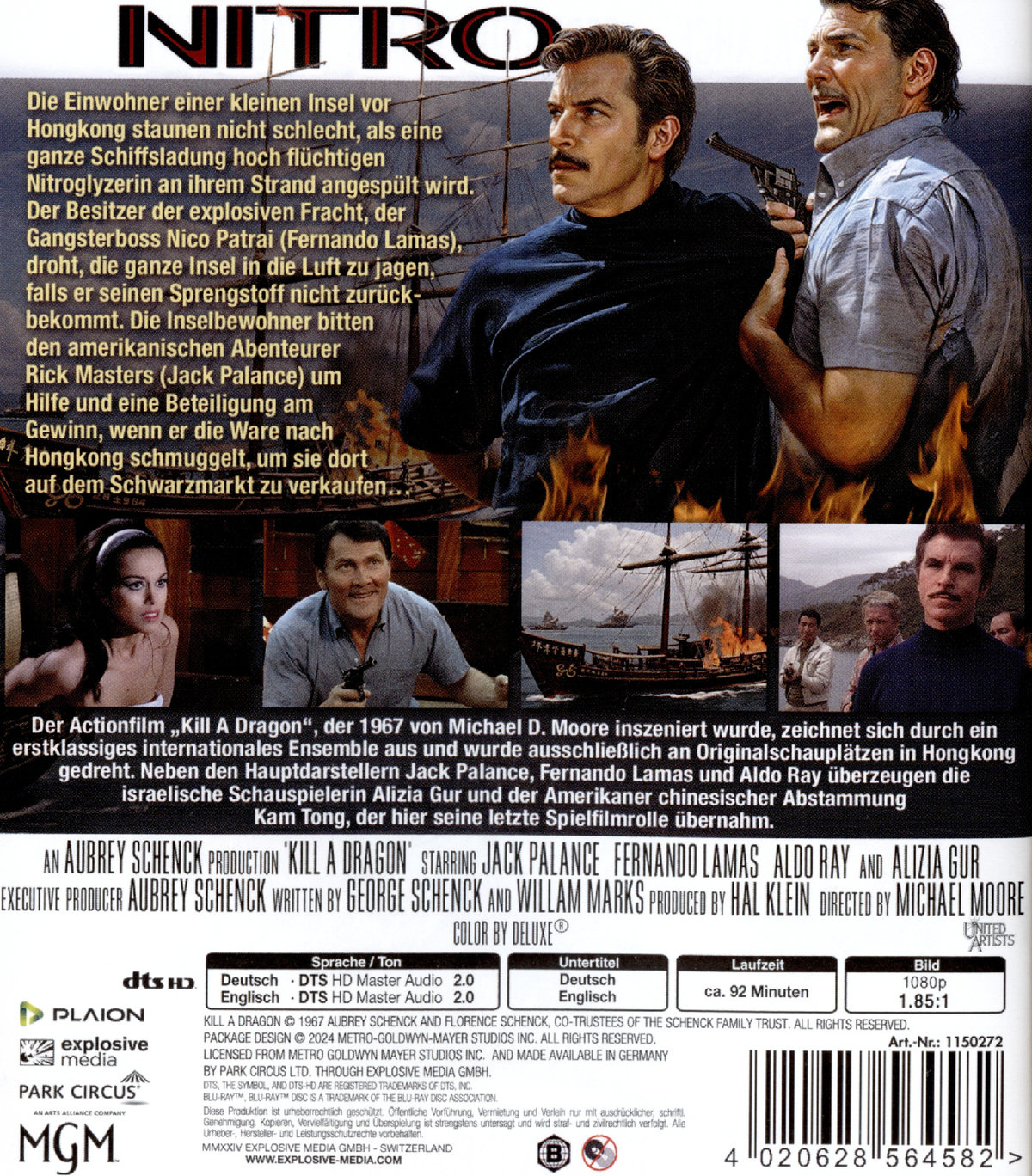 „Nitro“ spielt in und um Hongkong und Jack Palance spielt Rick Masters (das ist mal ein filmischer Name für einen Helden), einen amerikanischen Alleskönner, der mit seiner Geliebten, der Nachtclub-„Hostess“ Alizia Gur (die in „Liebesgrüße aus Moskau“ im denkwürdigen Zickenkrieg mit Martine Beswick antrat) einen entspannten Lebensstil pflegt. Inspiriert von „Die glorreichen Sieben“ wird Masters von Bauern aus einem verarmten Dorf angesprochen. Sie informieren ihn, dass vor kurzem ein Schiff auf ihrer Insel auf Grund gelaufen sei und die Besatzung es wegen seiner Ladung verlassen habe: eine gigantische Ladung hochflüchtigen Nitroglycerins. Die Bauern bieten Masters eine 50/50-Beteiligung am Gewinn an, wenn er die Ware nach Hongkong schmuggeln und auf dem Schwarzmarkt verkaufen kann. Allerdings gibt es einen Haken. Die Nitro-Lieferung ist Eigentum von Nico Patrai (Fernando Lamas), einem örtlichen Gangsterboss, der die Bauern warnt, die Waren herauszugeben, andernfalls werde ihr Dorf zerstört. Masters nimmt den Auftrag an und kontaktiert seine üblichen Mitarbeiter: Vigo (Aldo Ray), der jetzt Busausflüge für Touristen organisieren muss, Jimmy (Hans Lee), ein aufstrebender Boxer und Kampfsportexperte aus der Gegend, und sein britischer Manager Ian (Don Knight). Sie sind zahlenmäßig und waffentechnisch unterlegen, also müssen sie ihre Instinkte einsetzen, um Patrai zu überlisten.