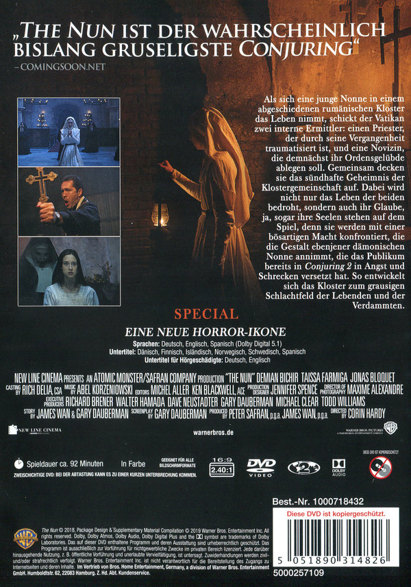 Als sich eine junge Nonne in einem abgeschiedenen rumänischen Kloster das Leben nimmt, schickt der Vatikan zwei interne Ermittler: einen Priester, der durch seine Vergangenheit traumatisiert ist, und eine Novizin, die demnächst ihr Ordensgelübde ablegen soll. Gemeinsam decken sie das sündhafte Geheimnis der Klostergemeinschaft auf. Dabei wird nicht nur das Leben der beiden bedroht, sondern auch ihr Glaube, ja, sogar ihre Seelen stehen auf dem Spiel, denn sie werden mit einer bösartigen Macht konfrontiert, die die Gestalt ebenjener dämonischen Nonne annimmt, die das Publikum bereits in „Conjuring 2“ in Angst und Schrecken versetzt hat. So entwickelt sich das Kloster zum grausigen Schlachtfeld der Lebenden und der Verdammten.