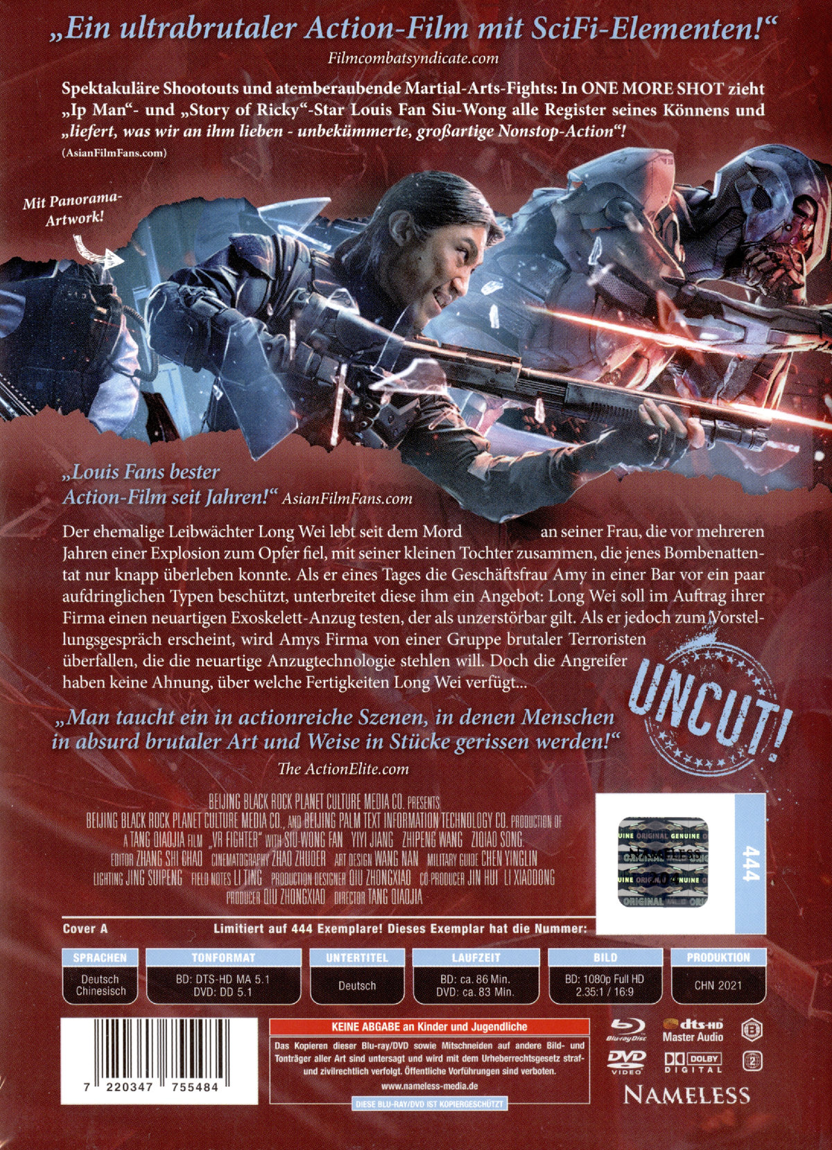 Inhalt: Spektakuläre Shootouts und atemberaubende Martial-Arts-Fights: In ONE MORE SHOT zieht „Ip Man“- und „Story of Ricky“-Star Louis Fan Siu-Wong alle Register seines Könnens und „liefert, was wir an ihm lieben - unbekümmerte, großartige Nonstop-Action“! (AsianFilmFans.com) Der ehemalige Leibwächter Long Wei lebt seit dem Mord an seiner Frau, die vor mehreren Jahren einer Explosion zum Opfer fiel, mit seiner kleinen Tochter zusammen, die jenes Bombenattentat nur knapp überleben konnte. Als er eines Tages die Geschäftsfrau Amy in einer Bar vor ein paar aufdringlichen Typen beschützt, unterbreitet diese ihm ein Angebot: Long Wei soll im Auftrag ihrer Firma einen neuartigen Exoskelett-Anzug testen, der als unzerstörbar gilt. Als er jedoch zum Vorstellungsgespräch erscheint, wird Amys Firma von einer Gruppe brutaler Terroristen überfallen, die die neuartige Anzugtechnologie stehlen will. Doch die Angreifer haben keine Ahnung, über welche Fertigkeiten Long Wei verfügt...