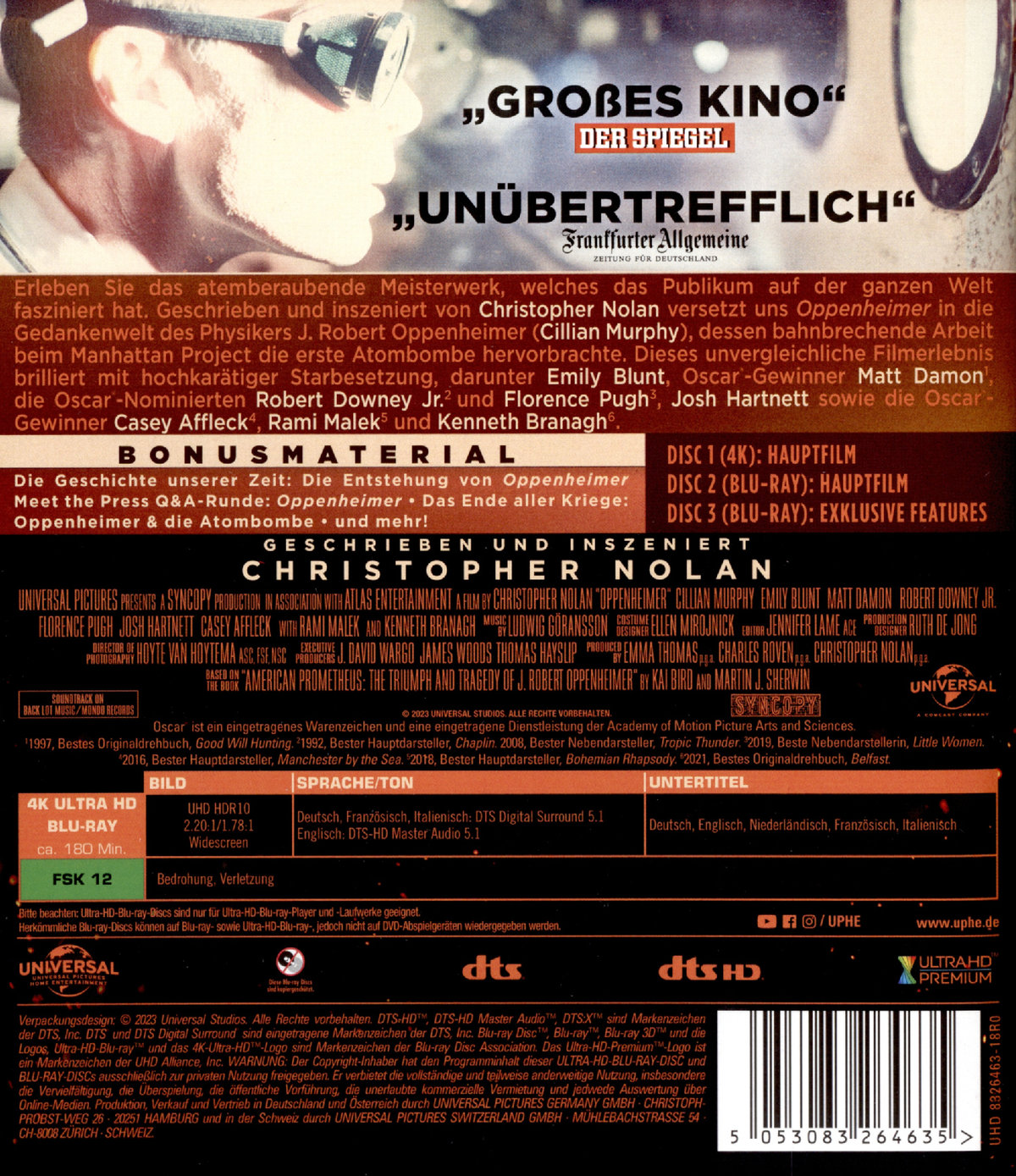 Erleben Sie das atemberaubende Meisterwerk, welches das Publikum auf der ganzen Welt fasziniert hat. Geschrieben und inszeniert von Christopher Nolan versetzt uns "Oppenheimer" in die Gedankenwelt des Physikers J. Robert Oppenheimer (Cillian Murphy), dessen bahnbrechende Arbeit beim Manhattan Project die erste Atombombe hervorbrachte.Dieses unvergleichliche Filmerlebnis brilliert mit hochkarätiger Starbesetzung, darunter Emily Blunt, Oscar®-Gewinner Matt Damon , die Oscar®-Nominierten Robert Downey Jr. und Florence Pugh, Josh Hartnett sowie die Oscar®-Gewinner Casey Affleck, Rami Malek und Kenneth Branagh.