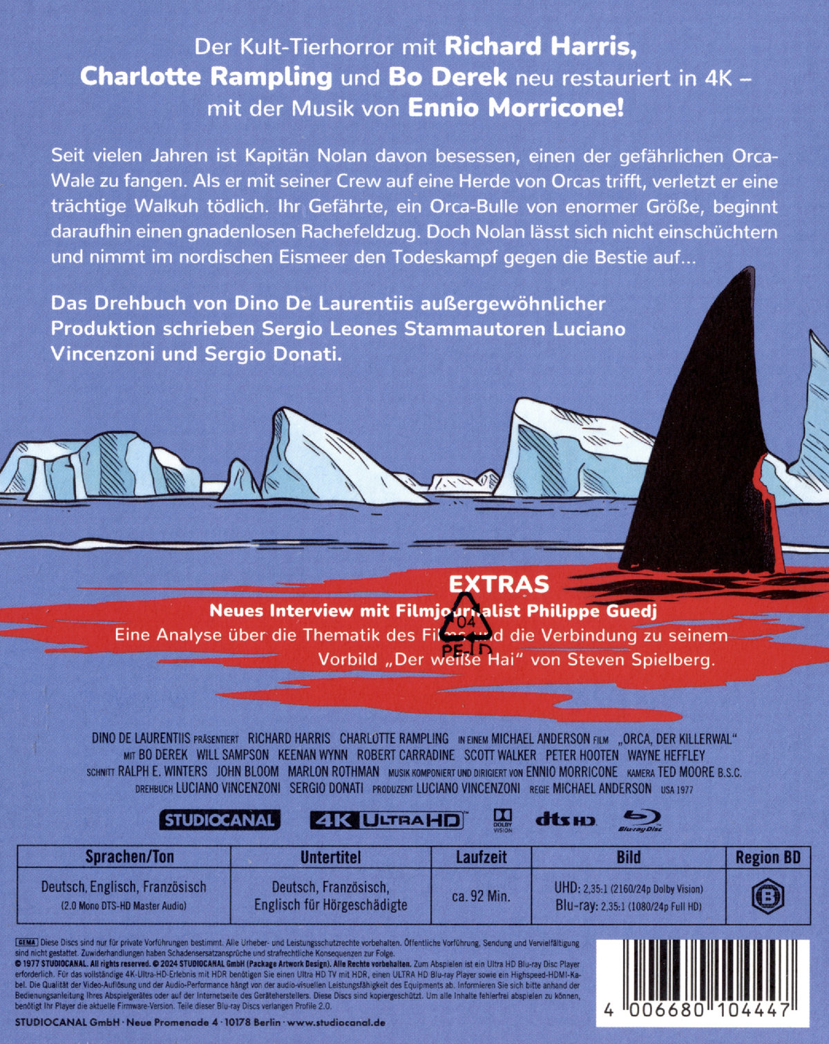 Seit vielen Jahren ist Kapitän Nolan (Richard Harris) davon besessen, einen Orca zu fangen. Obwohl ihn die Meeresbiologin Rachel Bedford (Charlotte Rampling) vor dem riskanten Unterfangen warnt, sticht er mit seiner Crew in See. Als die Besatzung auf eine Schule von Orcas trifft, verletzt Nolan versehentlich eine trächtige Walkuh und ihr Junges tödlich. Ihr Gefährte, ein Orca-Bulle von enormer Größe, beginnt daraufhin einen gnadenlosen Rachefeldzug, dem mehrere Crewmitglieder zum Opfer fallen. Doch Nolan lässt sich nicht einschüchtern und nimmt im nordischen Eismeer den Todeskampf gegen die Bestie auf. (1 4K-UHD + 1 Blu-ray)