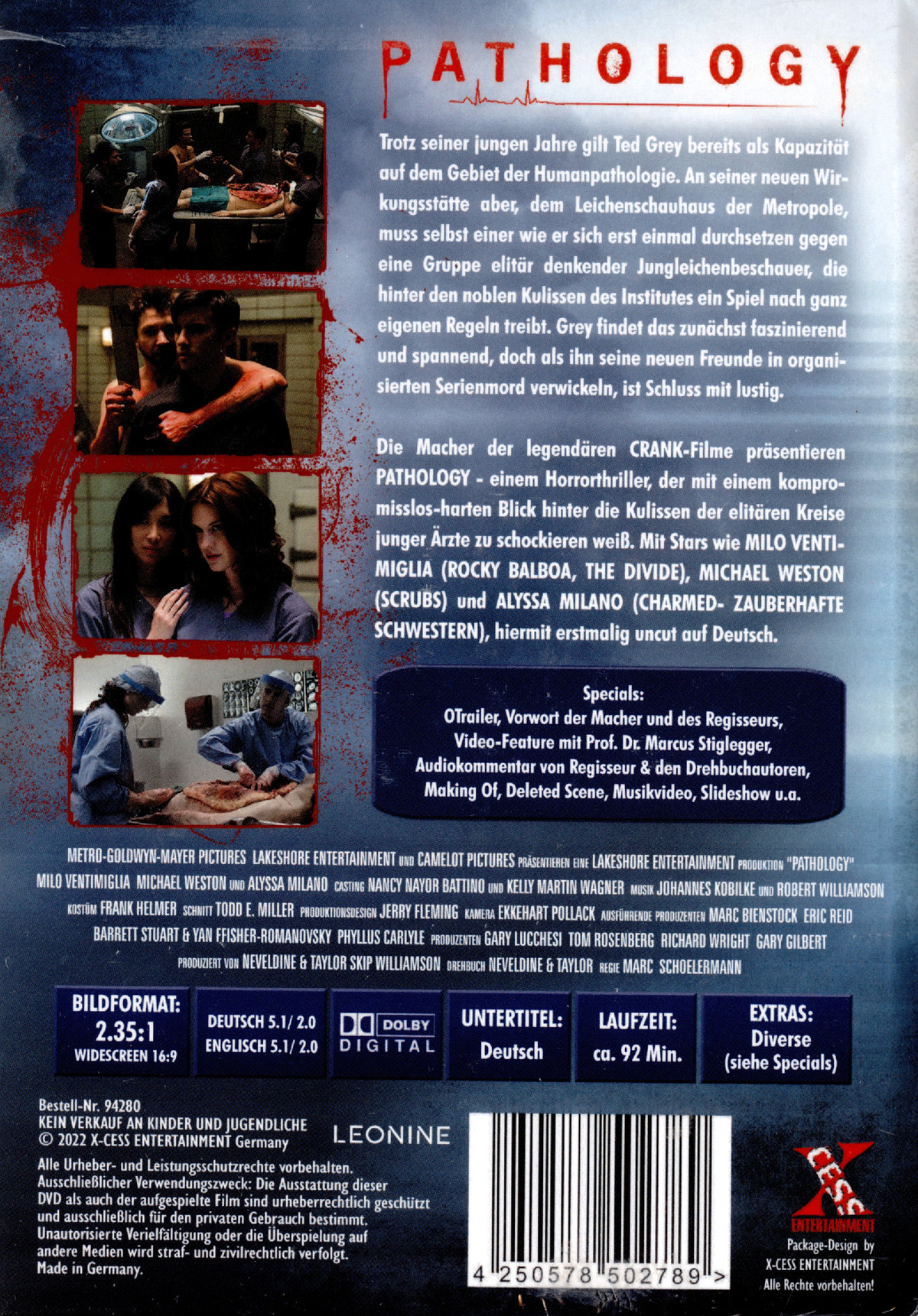 Die Macher der legendären CRANK-Filme präsentieren PATHOLOGY - einem Horrorthriller, der mit einem kompromisslos-harten Blick hinter die Kulissen der elitären Kreise junger Ärzte zu schockieren weiß. Mit Stars wie MILO VENTIMIGLIA (ROCKY BALBOA, THE DIVIDE), MICHAEL WESTON (SCRUBS) und ALYSSA MILANO (CHARMED- ZAUBERHAFTE SCHWESTERN), hiermit erstmalig uncut auf Deutsch.